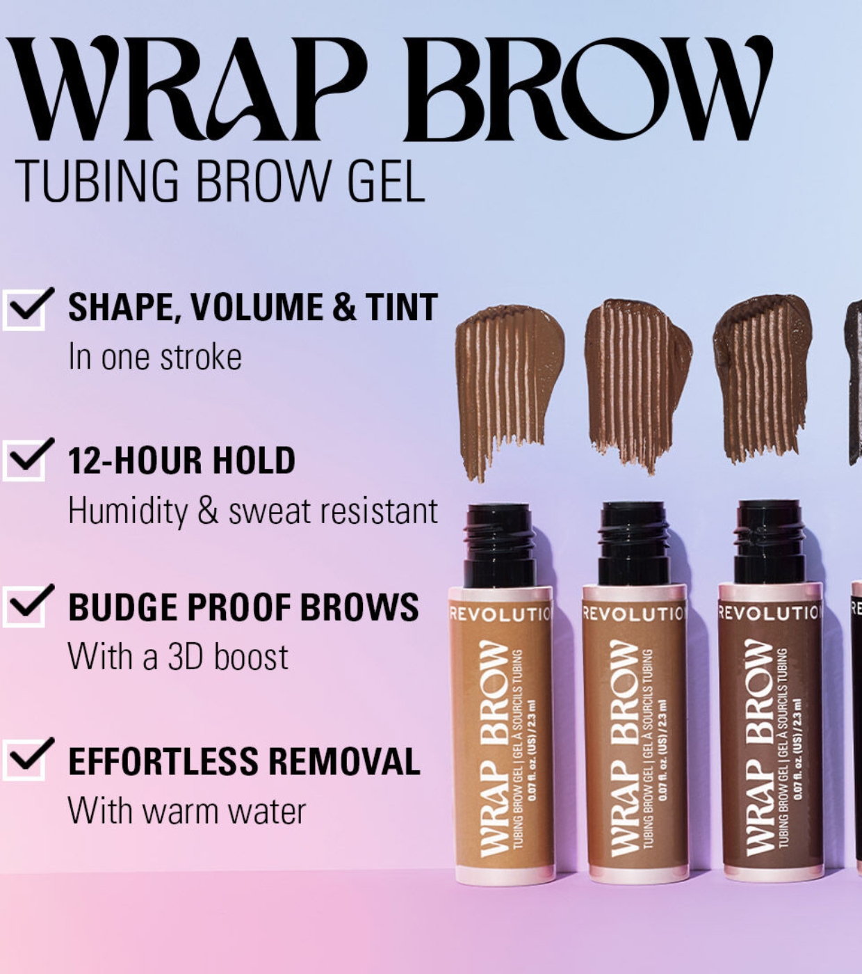 Mit dem Wrap Brow Augenbrauengel von Revolution können Sie Ihre Augenbrauen in einem Schritt definieren, fixieren und färben. Das innovative Gel mit Tubing-Technologie umhüllt jedes einzelne Haar und sorgt so für einen dichteren, definierteren und natürlicheren 3D-Effekt.