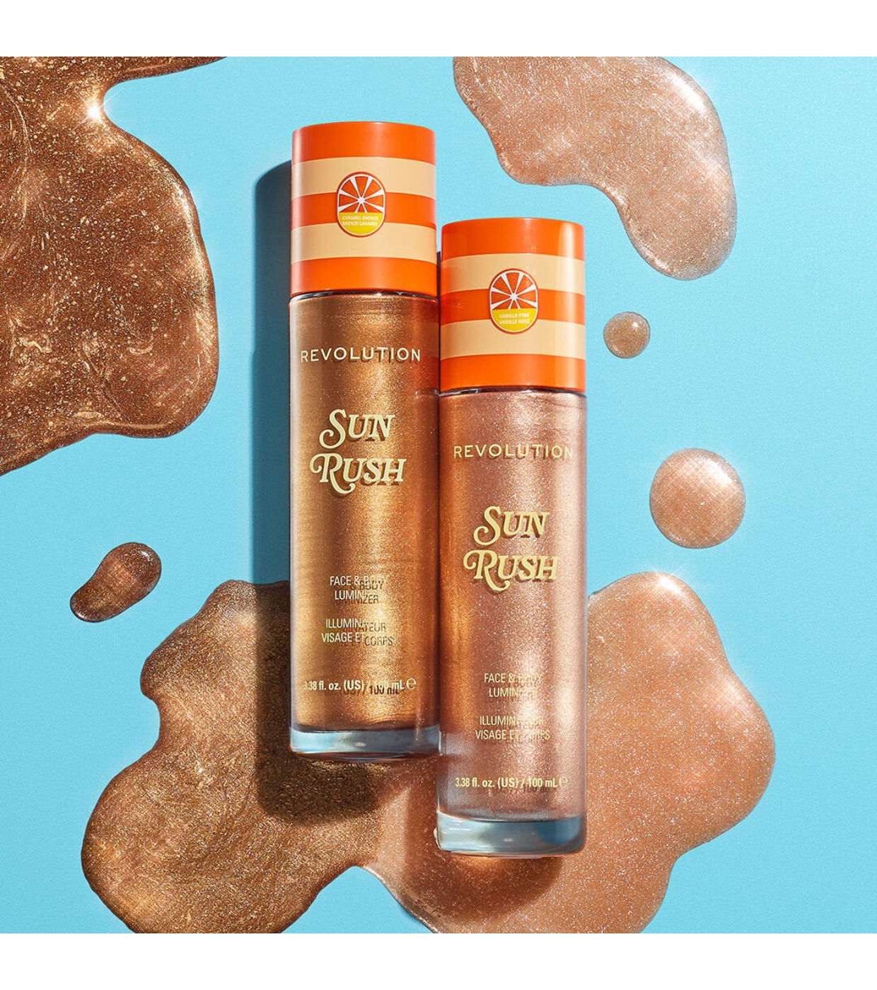 Mit dem Sun Rush Body Highlighter von Revolution erzielen Sie einen saftigen, strahlenden Teint von Kopf bis Fuß. Er verschmilzt nahtlos mit der Haut.