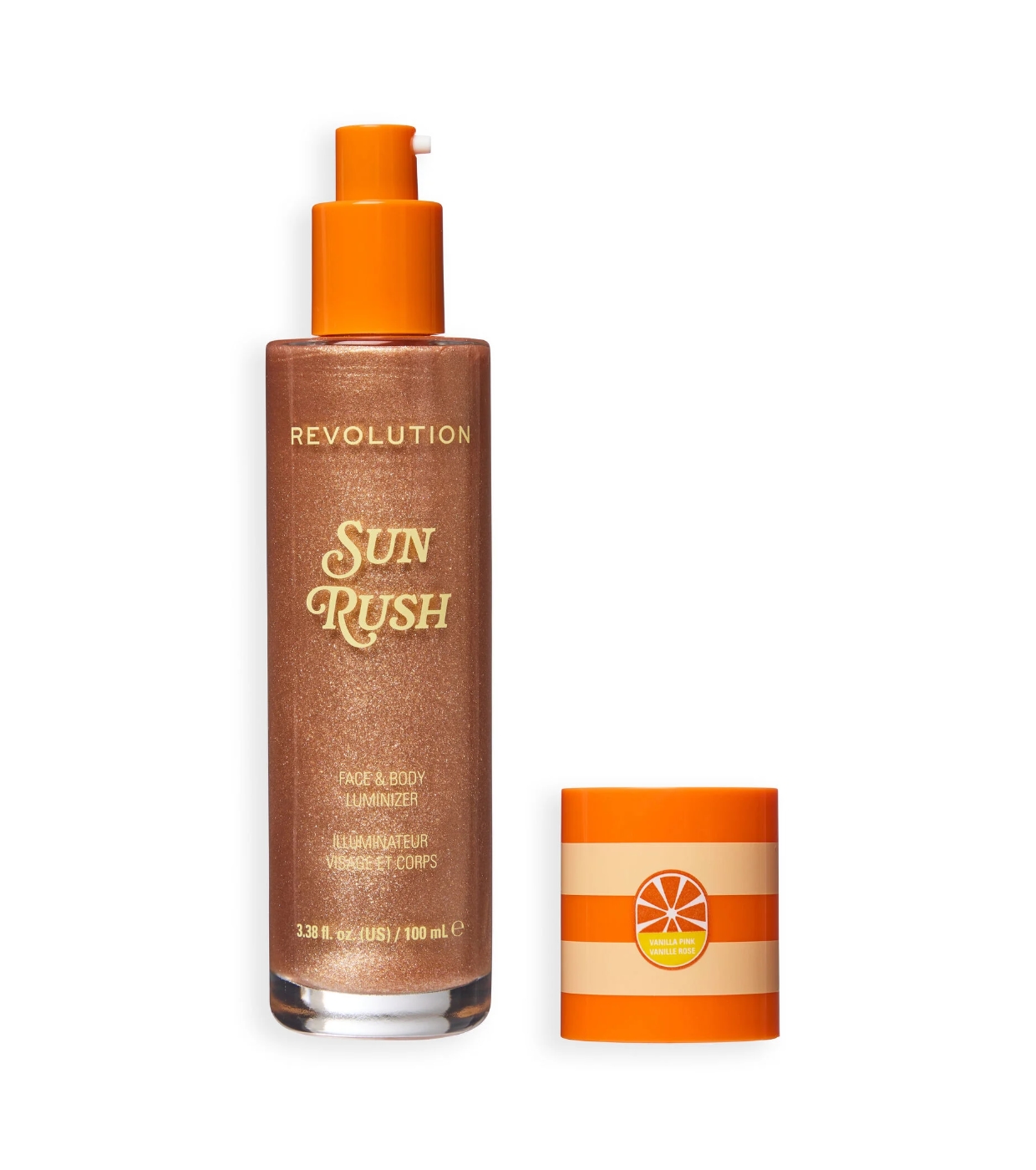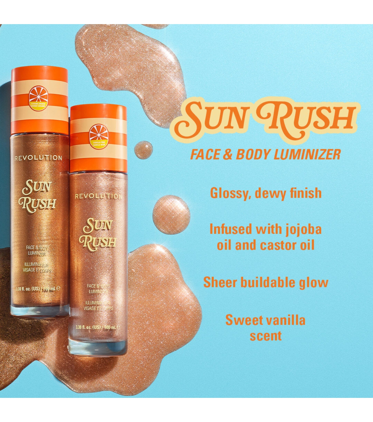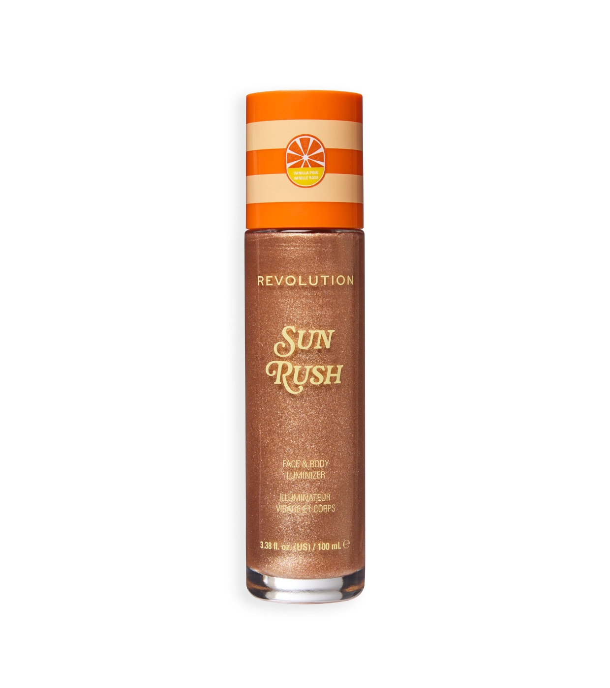 Mit dem Sun Rush Body Highlighter von Revolution erzielen Sie einen saftigen, strahlenden Teint von Kopf bis Fuß. Er verschmilzt nahtlos mit der Haut.