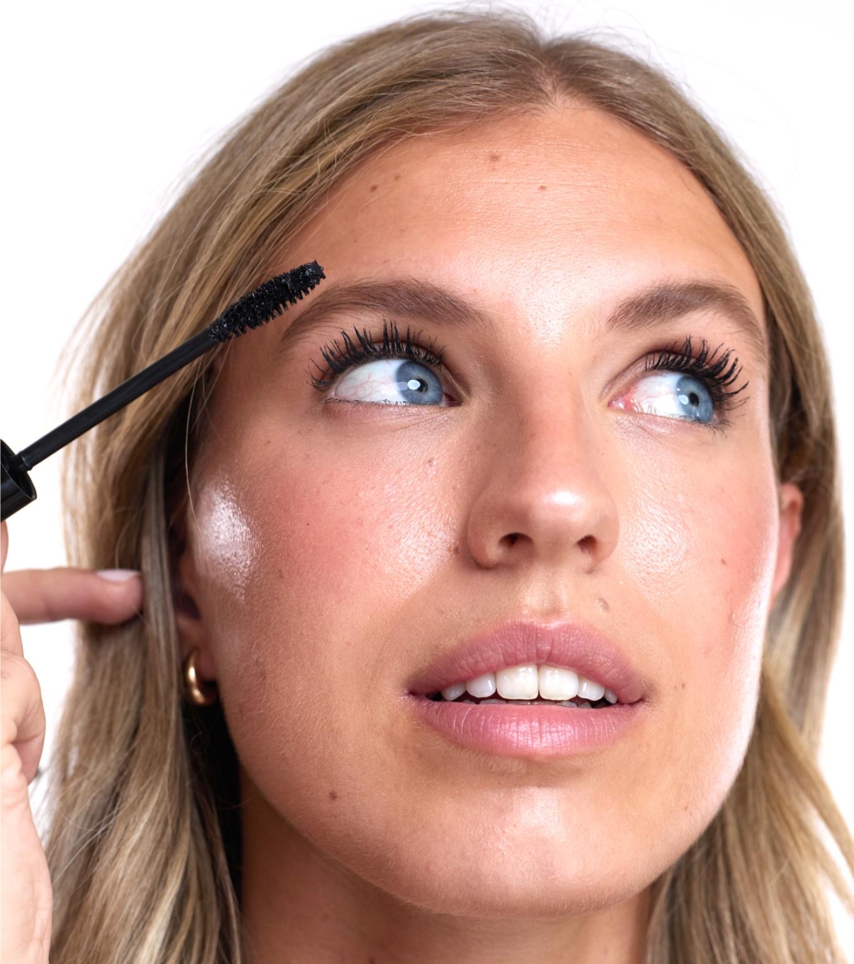 Setzen Sie das Bürstchen am Wimpernansatz an und führen Sie kleine Zickzackbewegungen aus, damit die Fasern die Wimpern gut greifen, während Sie es zu den Spitzen schieben.