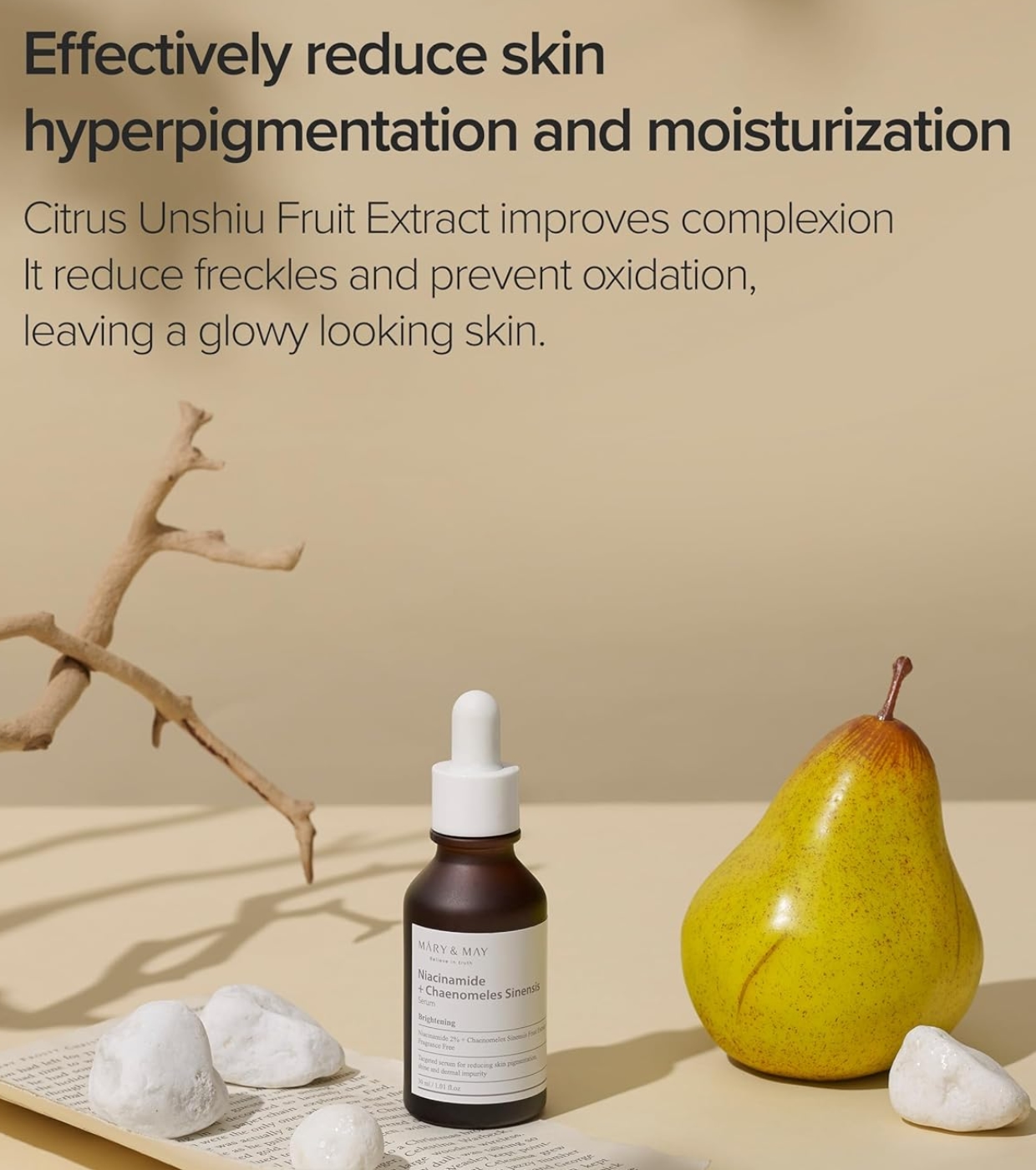 Mary & May Niacinamide + Chaenomeles Sinensis Serum ist ein leichtes, schnell einziehendes Gesichtsserum, das die Ausstrahlung verbessert, die Haut ausgleicht und den Ton vereinheitlicht.