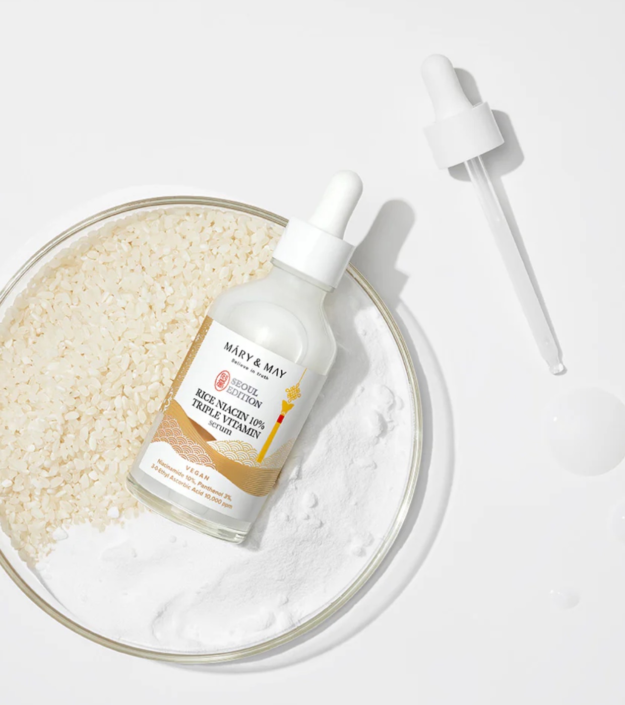 Rice niacin 10% Triple Vitamin Serum Mary & May Das aufhellende Gesichtsserum enthält 10 % Niacinamid, kombiniert mit einem leistungsstarken Dreifach-Vitaminkomplex und Glutathion, was die Leuchtkraft der Haut verbessert, den Hautton vereinheitlicht und für ein strahlendes und revitalisiertes Aussehen sorgt.