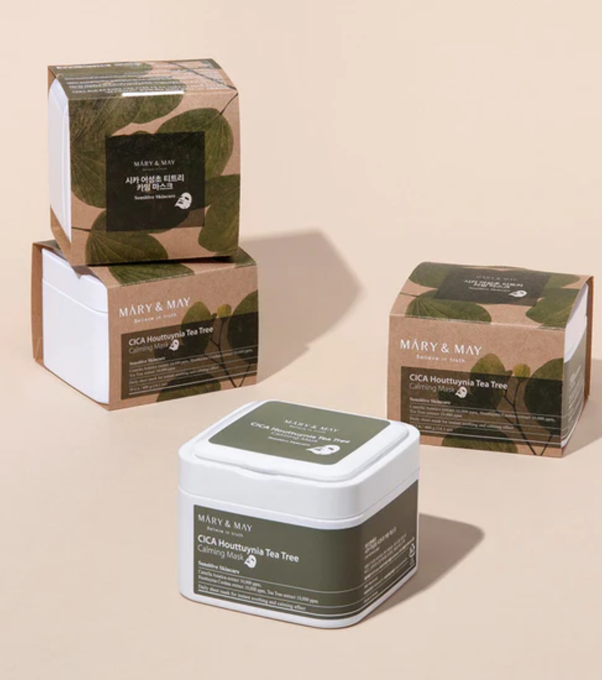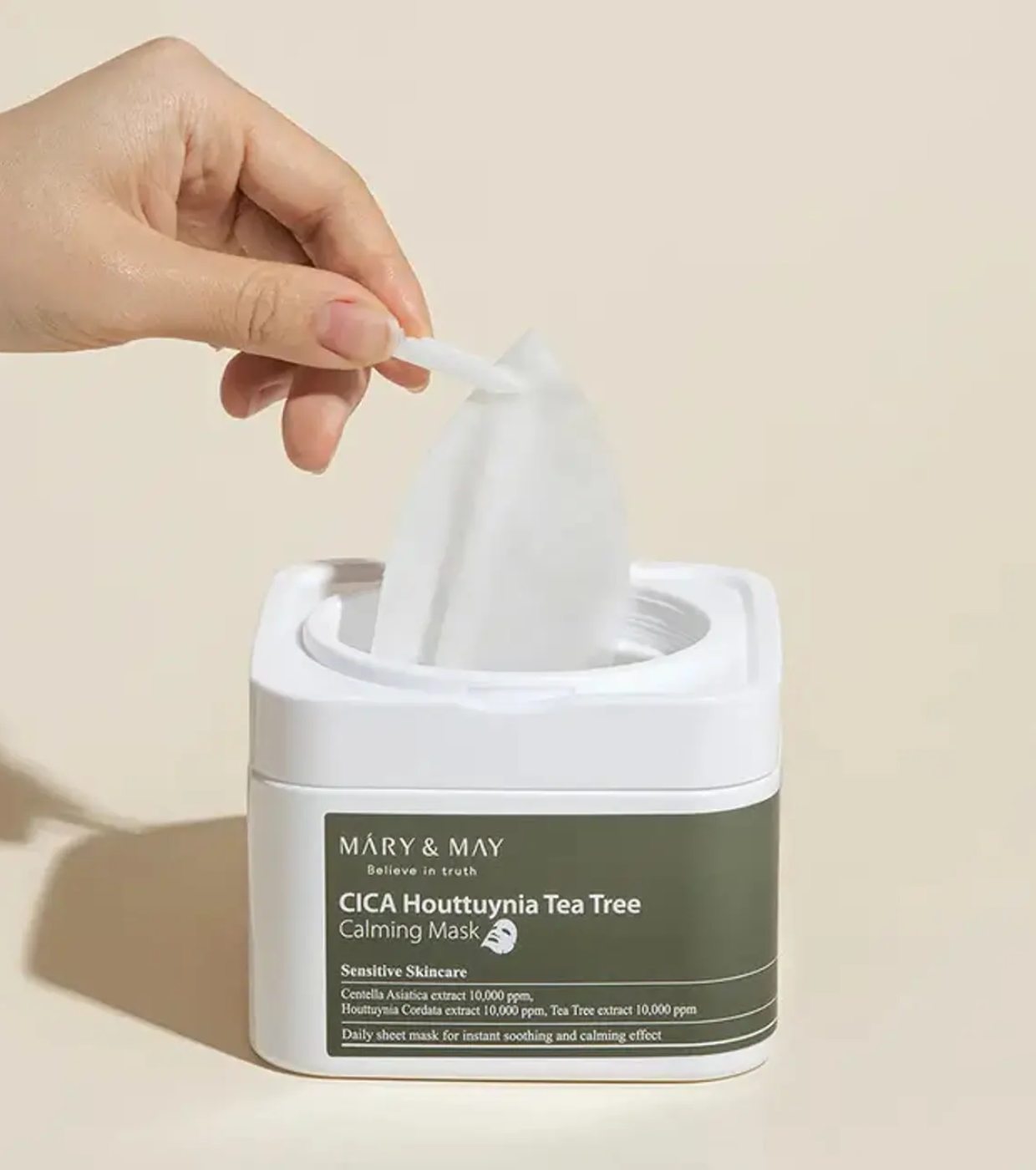Cica Houttuynia Tea Tree de Mary & May, una mascarilla hipoalergénica en formato estuche, ideal para uso diario durante 30 días.