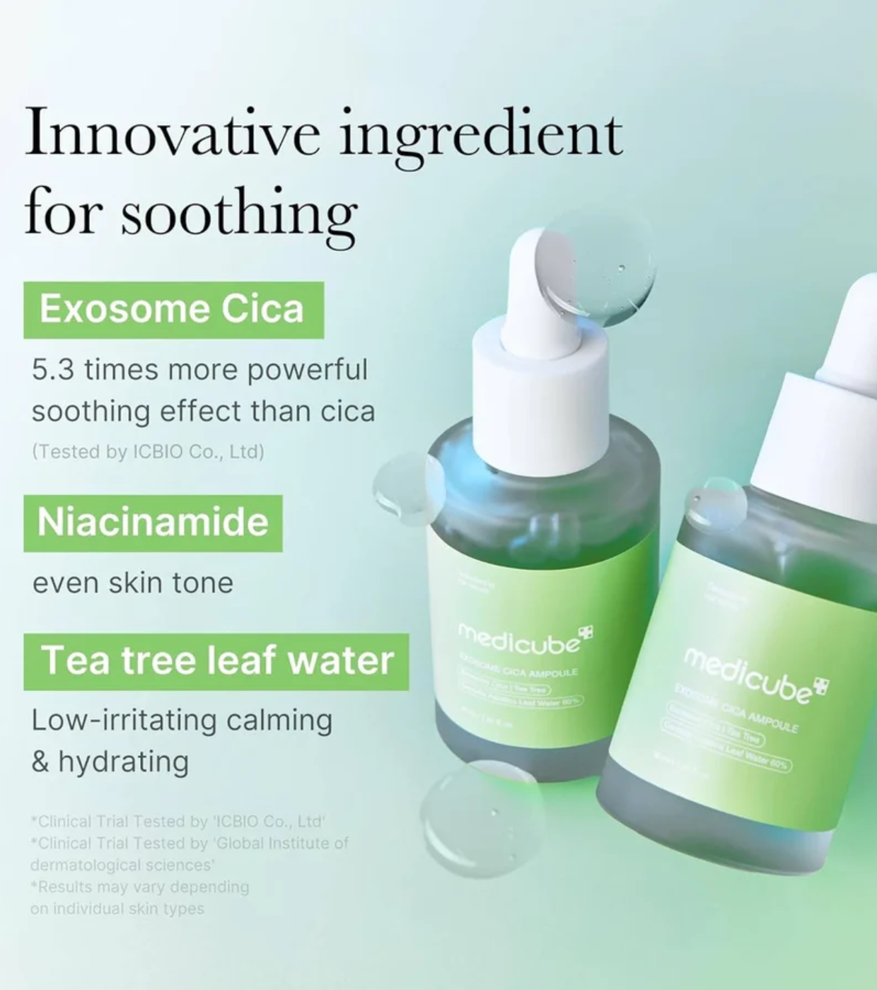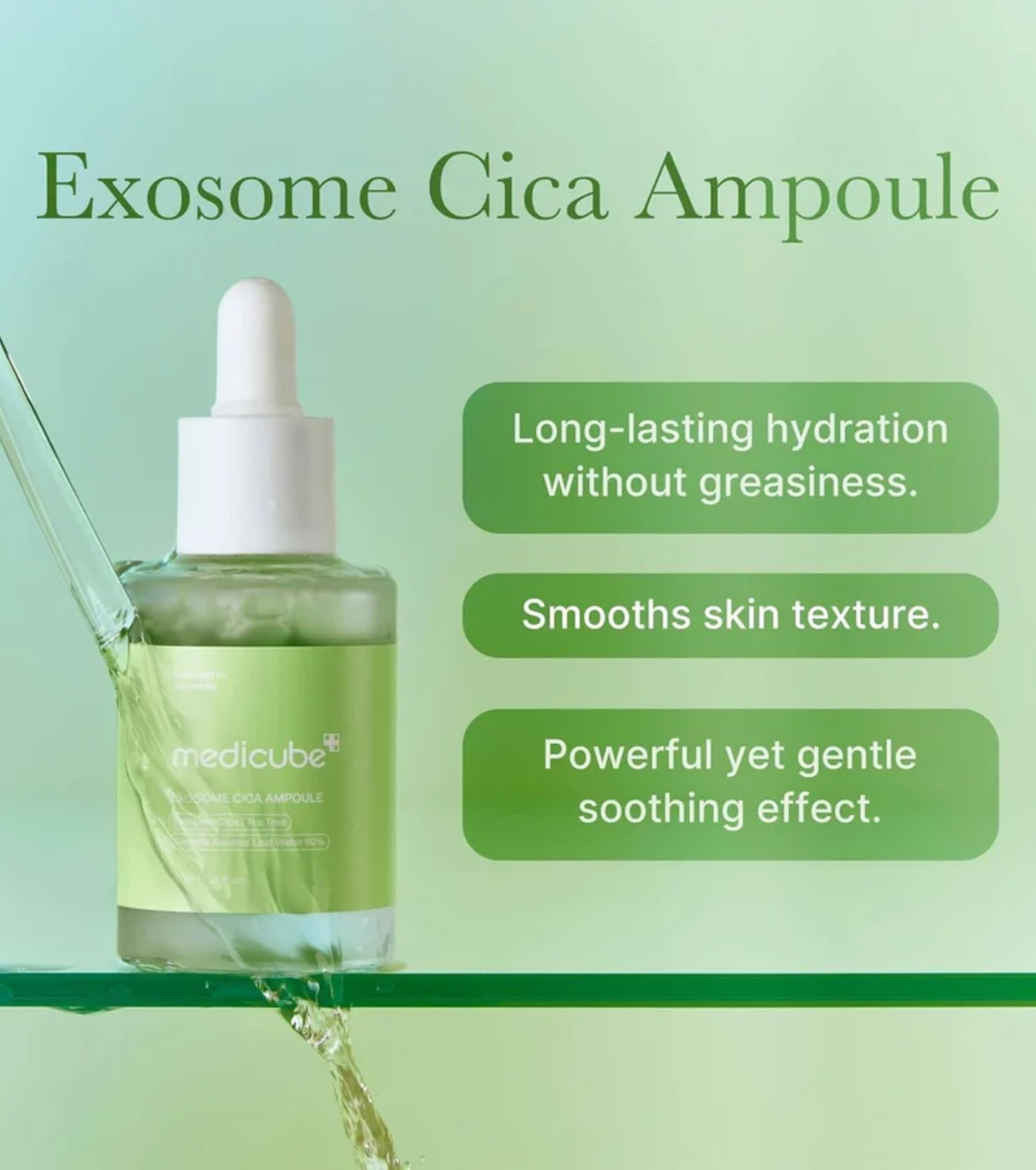 Reparieren und balancieren Sie Ihre Haut mit dem beruhigenden Serum Exosome Cica Ampoulle von Medicube , das speziell für empfindliche, dehydrierte oder zu Reizungen neigende Haut entwickelt wurde.