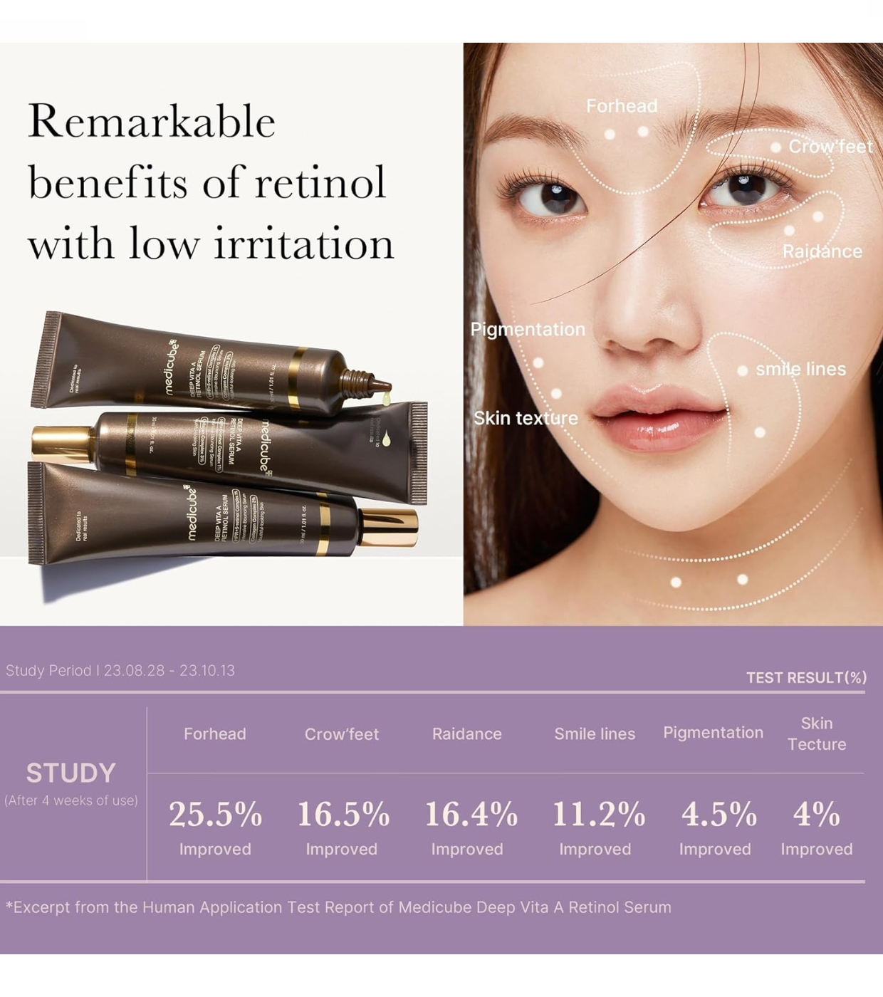 Verjüngen Sie Ihre Haut mit Medicube Retinol und Vitamin C Medicube Serum , einem intensiven Serum mit Retinol (Vitamin A), einem der wirksamsten Inhaltsstoffe zur Bekämpfung der Zeichen der Hautalterung.