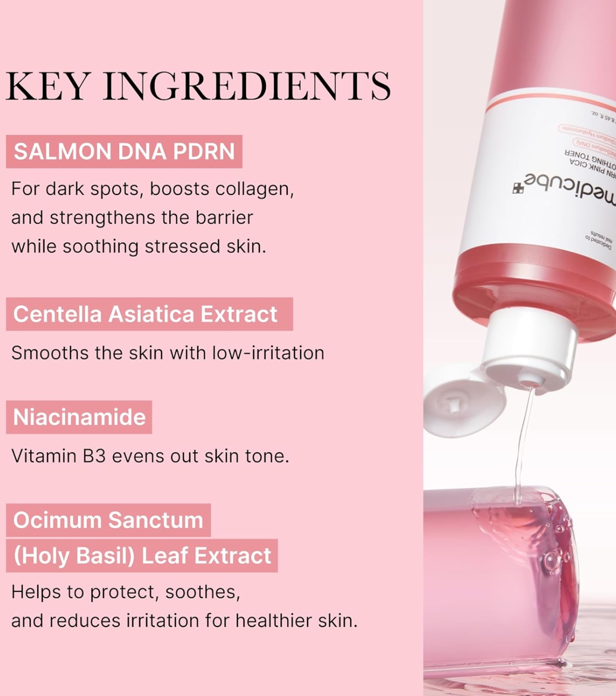 Medicube PDRN Pink Cica Soothing Toner ist ein beruhigendes und aufhellendes Gesichtswasser mit einem zarten rosa Farbton, das entwickelt wurde, um die Hautbarriere zu stärken, die Haut intensiv mit Feuchtigkeit zu versorgen und sie auf die weitere Pflegeroutine vorzubereiten.