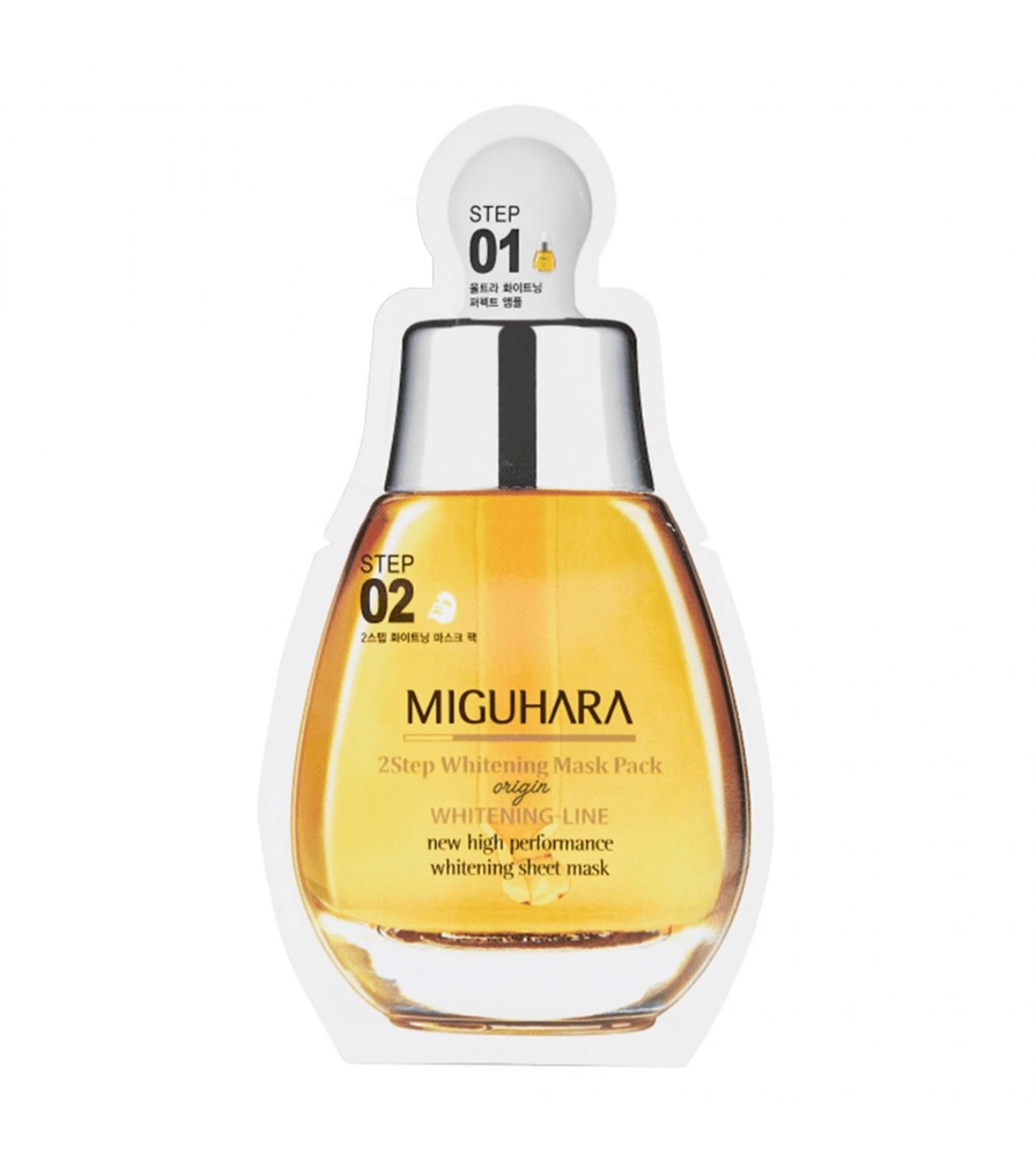 Genießen Sie die intensive Pflege koreanischer Masken mit dem 2Step Whitening Mask Pack Origin von Miguhara, einer zweistufigen Lösung, die Serum und Tuchmaske kombiniert, um Ihren Hautton zu vereinheitlichen und aufzuhellen.