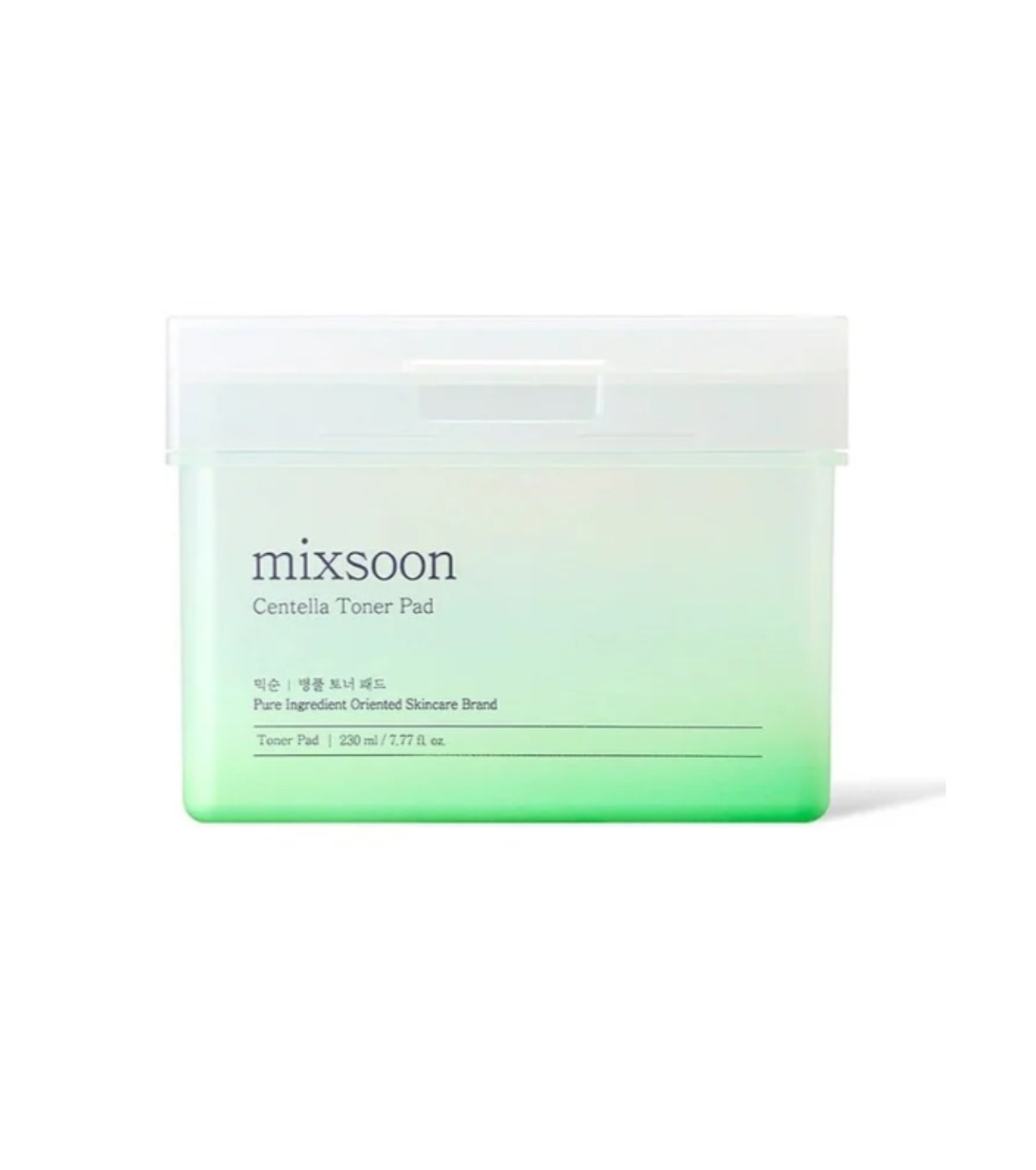 mixsoon Centella Toner Pad erfrischt und revitalisiert gestresste Haut mit seinen mit Centella Asiatica angereicherten Tonerpads sowie Allantoin, Betain und Ceramide NP zur Stärkung der Hautbarriere.