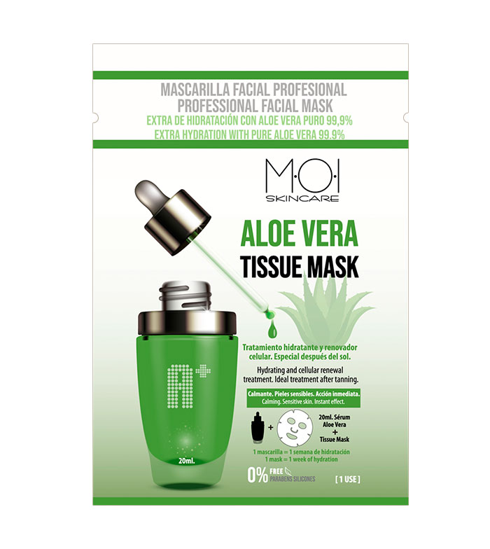 Bei einer Einzeldosis, die eine Mikrofasermaske (0,2 mm dick) enthält, die mit einem mit Aloe Vera angereicherten Serum imprägniert ist, das sich perfekt an die Haut anpasst.