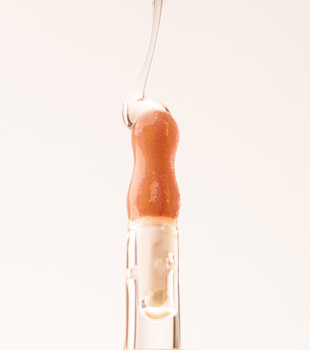 Der sanduhrförmige Applikator massiert und gibt gleichzeitig Lippenöl ab.