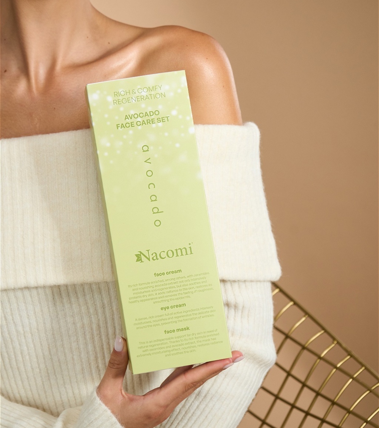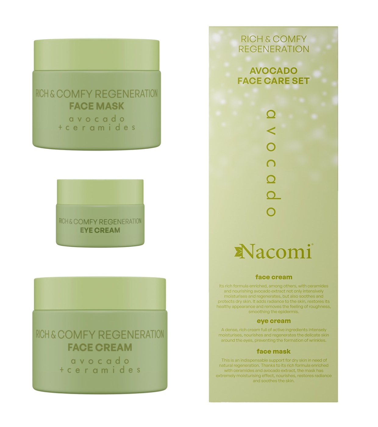 Rich & comfy regeneration - Krem do twarzy - Awokado/ Face cream - Avocado: Skladniki(INCI)/ Ingredients: Aqua, Persea Gratissima Oil, Coco-Caprylate/Caprate, Olea Europea Fruit Oil, Polyglyceryl-3 Distearate, Panthenol, Propanediol, Glycerin, Betaine, Trehalose, Cetearyl Alcohol, Sorbitol, Persea Gratissima Fruit Extract, Ceramide AP, Ceramide NP, Ceramide EOP, Hyaluronic Acid, Hydrolyzed Hyaluronic Acid, Sodium Hyaluronate, Sodium Hyaluronate Crosspolymer, Cholesterol, Phytosphingosine, Allantoin, Inulin, Cellulose, Fructose, Glucose, Maltodextrin, Hydrolyzed Glycosaminoglycans, Tocopheryl Acetate, Sodium Cetearyl Sulfate, Tetrasodium Glutamate Diacetate, Sodium Levulinate, Polyglyceryl-10 Stearate, Polyglyceryl-6 Behenate, Glyceryl Stearate Citrate, Xanthan Gum, Cellulose Gum, Biosaccharide Gum-1, Parfum, Triethyl Citrate, Benzyl Glycol, Behenic Acid, Citric Acid, Ethylhexylglycerin, Glyceryl Stearate, Sodium Benzoate, Sodium Sulfate, Sodium Hydroxide, Raspberry Ketone, Potassium Sorbate, Amyl Cinnamal, Cl 19140, CI 42090. Rich & comfy regeneration - Krem pod oczy - Awokado/ Eye cream - Avocado: Skladniki(INCI)/ Ingredients: Aqua, Persea Gratissima Oil, Propanediol, Coco-Caprylate/Caprate, Polyglyceryl-3 Distearate, Panthenol, Glycerin, Betaine, Cetearyl Alcohol, Trehalose, Phytosterols, Sorbitol, Ceramide NP, Ceramide AP, Ceramide EOP, Hyaluronic Acid, Hydrolyzed Hyaluronic Acid, Sodium Hyaluronate, Sodium Hyaluronate 15 ml Crosspolymer, Olea Europaea Fruit Oil, Cholesterol, Phytosphingosine, Inulin, Cellulose, Fructose, Glucose, Maltodextrin, Hydrolyzed Glycosaminoglycans, Tocopheryl Acetate, Tetrasodium Glutamate Diacetate, Polyglyceryl-10 Stearate, Polyglyceryl-6 Behenate, Ascorbyl Palmitate, Xanthan Gum, Cellulose Gum, Biosaccharide Gum-1, Parfum, Sorbitan Oleate, Citric Acid, Triethyl Citrate, Glyceryl Stearate Citrate, Glyceryl Stearate, Behenic Acid, Benzyl Glycol, Ethylhexylglycerin, Raspberry Ketone, Sodium Cetearyl Sulfate, Sodium Levulinate, Sodium. Benzoate, Sodium Sulfate, Sodium Hydroxide, Potassium Sorbate, Amyl Cinnamal, Cl 19140, CI 42090. Rich & comfy regeneration - Maseczka do twarzy - Awokado/ Face mask-Avocado: Skiadniki(INCI)/ Ingredients:Aqua, Persea Gratissima Oil, Cetearyl Alcohol, Glycerin, Trehalose, Coco-Caprylate/Caprate, Panthenol, Propanediol, Betaine, Sorbitol, Persea Gratissima Fruit Extract, Ceramide AP, Ceramide NP, Ceramide EOP, Hyaluronic Acid, Hydrolyzed Hyaluronic Acid, Sodium Hyaluronate, Sodium Hyaluronate Crosspolymer, Cholesterol, Phytosphingosine, Allantoin, Inulin, Cellulose, Fructose, Glucose, Maltodextrin, Hydrolyzed Glycosaminoglycans, Tocopheryl Acetate, Sodium Cetearyl Sulfate, Tetrasodium Glutamate Diacetate, Sodium Levulinate, Polyglyceryl-10 Stearate, Polyglyceryl-6 Behenate, Xanthan Gum, Cellulose Gum, Biosaccharide Gum-1, Parfum, Triethyl Citrate, Potassium Cetyl Phosphate, Benzyl Glycol, Behenic Acid, Citric Acid, Ethylhexylglycerin, Glyceryl Stearate, Sodium Benzoate, Sodium Sulfate, Sodium Hydroxide, Raspberry Ketone, Potassium Sorbate, Amyl Cinnamal, Cl 19140, CI 42090.