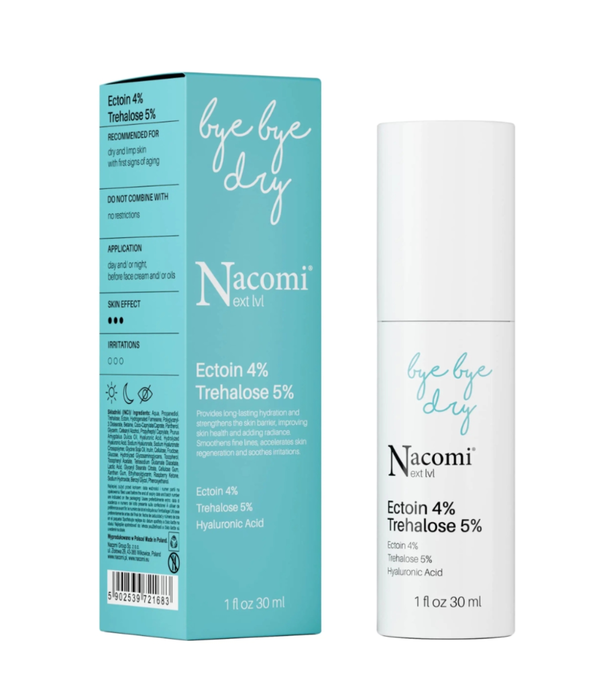 Entdecken Sie das Serum mit Ecotin 4 % Trehalose 5 % Bye Bye Dry von Nacomi , eine Behandlung, die den Feuchtigkeitsgehalt der Haut nachhaltig erhöht und sie vor Wasserverlust schützt, was sie ideal für die Pflege trockener Haut macht .