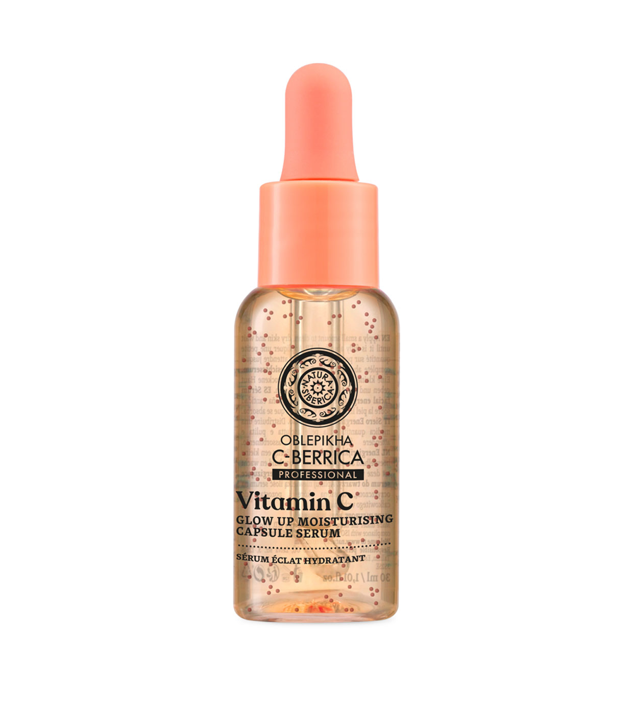 Verwandeln Sie Ihre Haut und strahlen Sie mit dem feuchtigkeitsspendenden Vitamin C-Gesichtsserum mit Glow Up-Kapseln aus der Oblepikha C-Berrica-Linie von Natura Siberica aus .