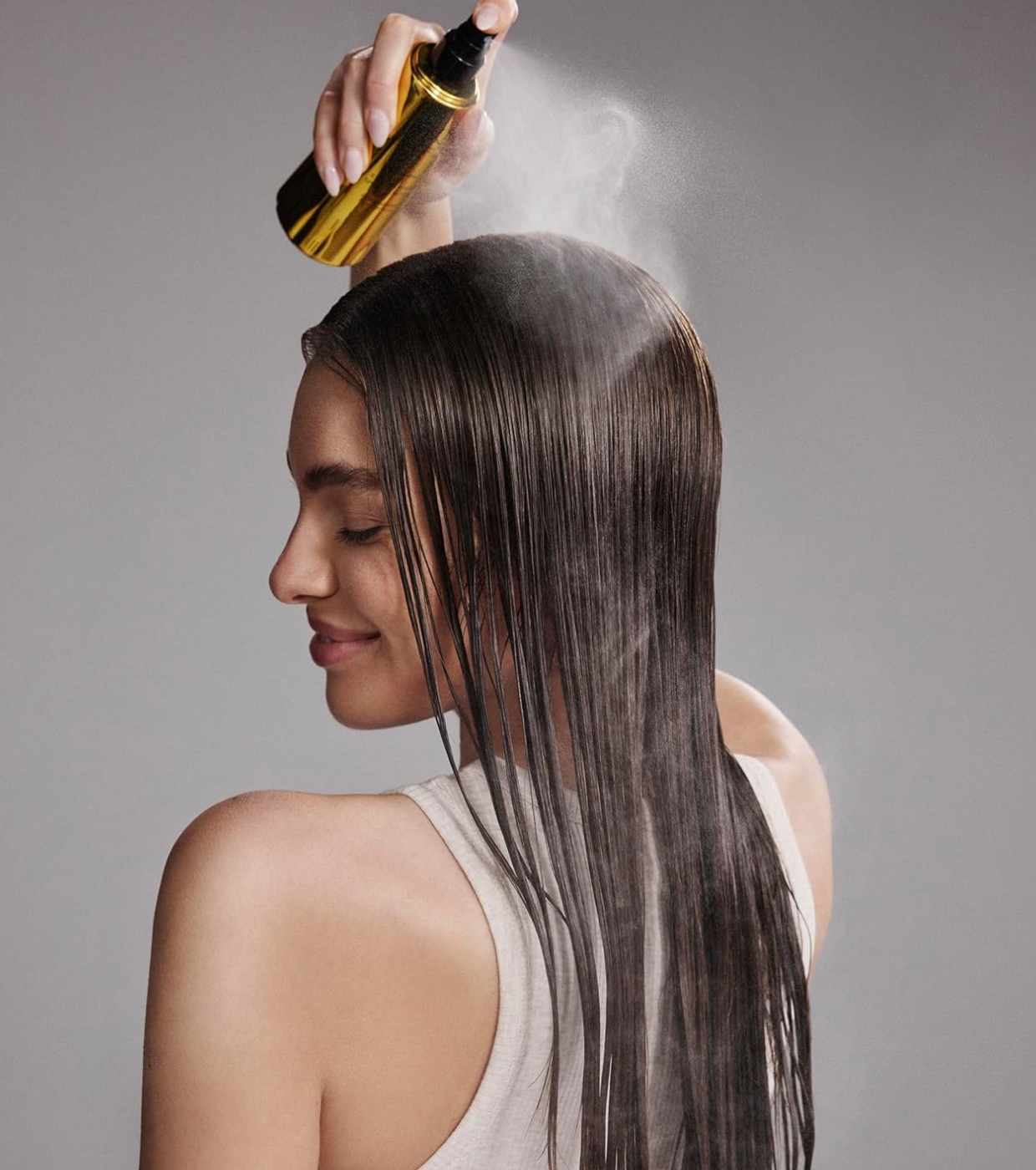 2. Sprühen Sie das Spray großzügig und gleichmäßig auf das handtuchtrockene (nicht nasse) Haar.