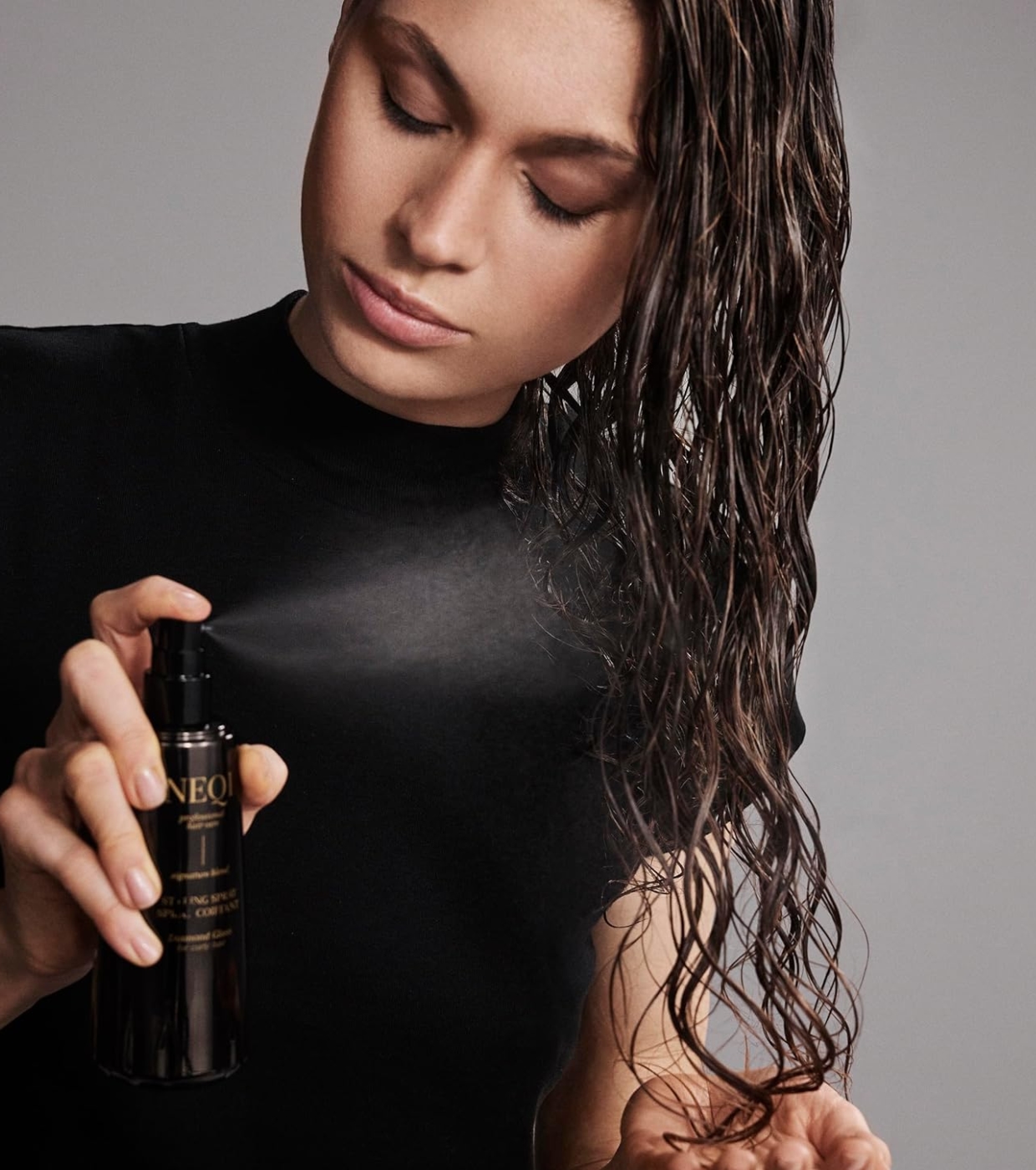 2. Sprühen Sie das Spray großzügig und gleichmäßig auf das handtuchtrockene (nicht nasse) Haar.