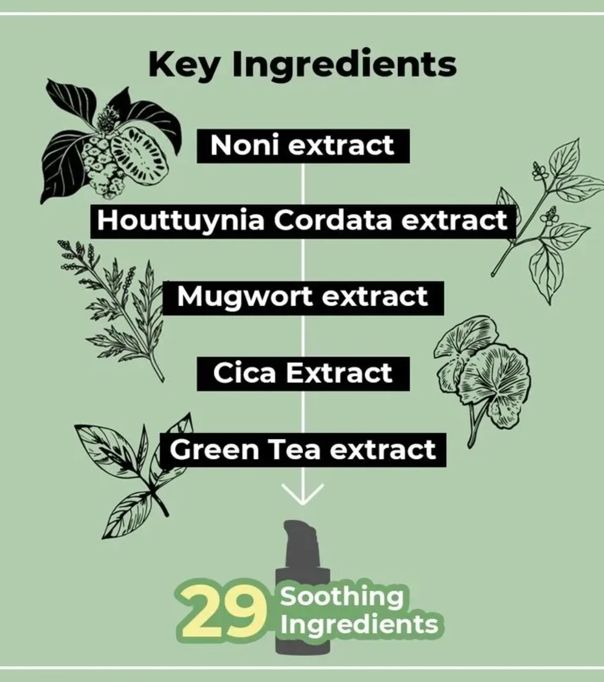 Morinda Citrifolia Extract, Butylene Glycol, Propanediol, 1,2-Hexanediol, Glycerin, Centella Asiatica Extract, Houttuynia Cordata Extract, Artemisia Princeps Leaf Extract, Paeonia Suffruticosa Root Extract, Leonurus Sibiricus Extract, Nelumbo Nucifera Leaf Extract, Melissa Officinalis Extract, Tremella Fuciformis (Mushroom) Extract, Lentinus Edodes Extract, Phyllostachys Nigra Leaf Extract, Saussurea Involucrata Extract, Corchorus Olitorius Leaf Extract, Ilex Paraguariensis Leaf Extract, Malva Sylvestris (Mallow) Flower Extract, Laminaria Japonica Extract, Rosa Damascena Flower Extract, Chrysanthemum Indicum Flower Extract, Solanum Melongena (Eggplant) Fruit Extract, Melia Azadirachta Leaf Extract, Scutellaria Baicalensis Root Extract, Polygonum Cuspidatum Root Extract, Glycyrrhiza Glabra (Licorice) Root Extract, Camellia Sinensis Leaf Extract, Melia Azadirachta Flower Extract, Hamamelis Virginiana (Witch Hazel) Extract, Chamomilla Recutita (Matricaria) Flower Extract, Rosmarinus Officinalis (Rosemary) Leaf Extract, Hydrolyzed Jojoba Protein, Aloe Barbadensis Leaf Extract, Melaleuca Alternifolia (Tea Tree) Leaf Water, Sodium Hyaluronate, Shea Butter, Allantoin, Caprylic/Capric Triglyceride, Asiaticoside, Madecassic Acid, Asiatic Acid, Ceramide NP, Glyceryl Polymethacrylate, Ammonium Acryloyldimethyltaurate/VP Copolymer, Hydrogenated Lecithin, Glyceryl Stearate, Pyridoxine HCl, Phospholipids, Cholesterol, Calcium Pantothenate, Arachidyl Glucoside, Silica, Stearic Acid, Maltodextrin, Tromethamine, Carbomer, Purified Water, Ethylhexylglycerin, Disodium EDTA, Ethanol