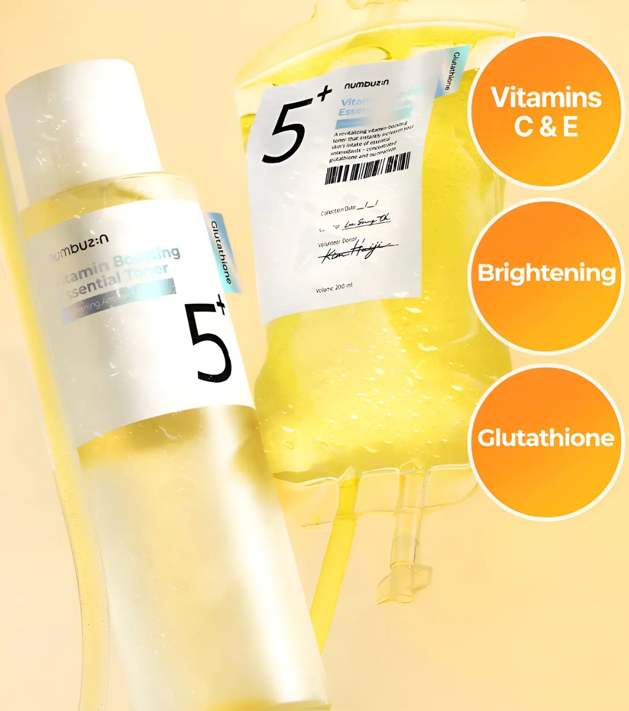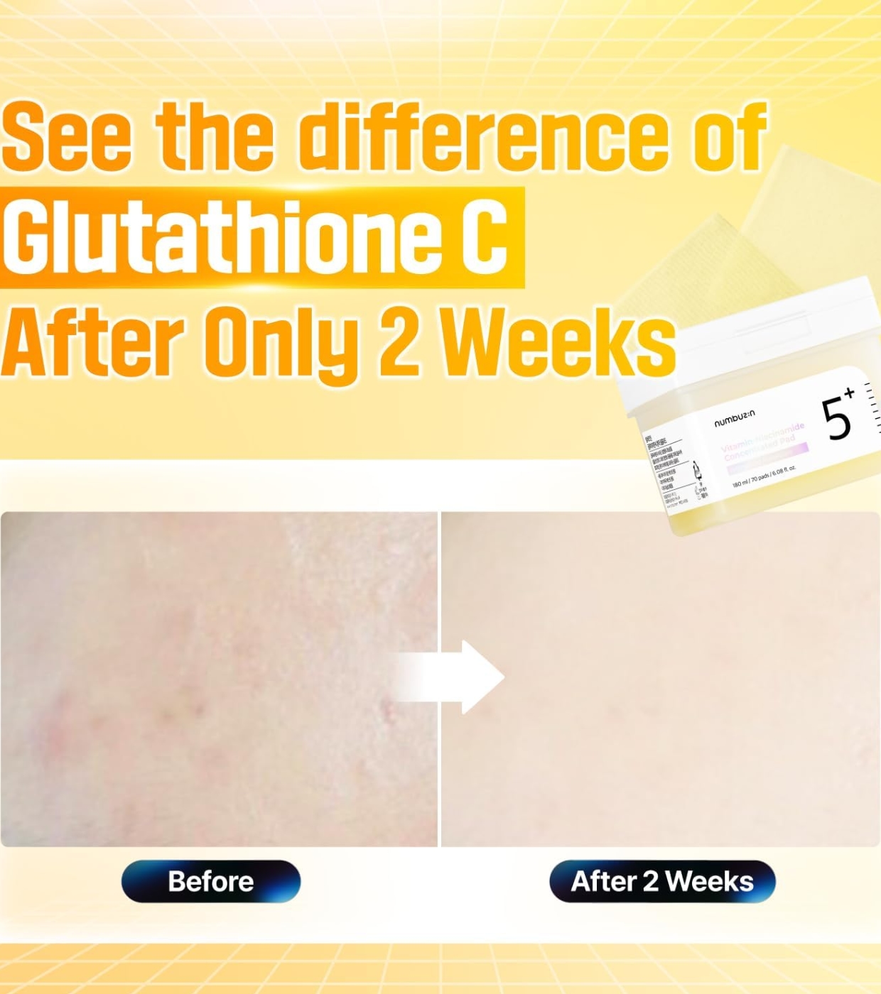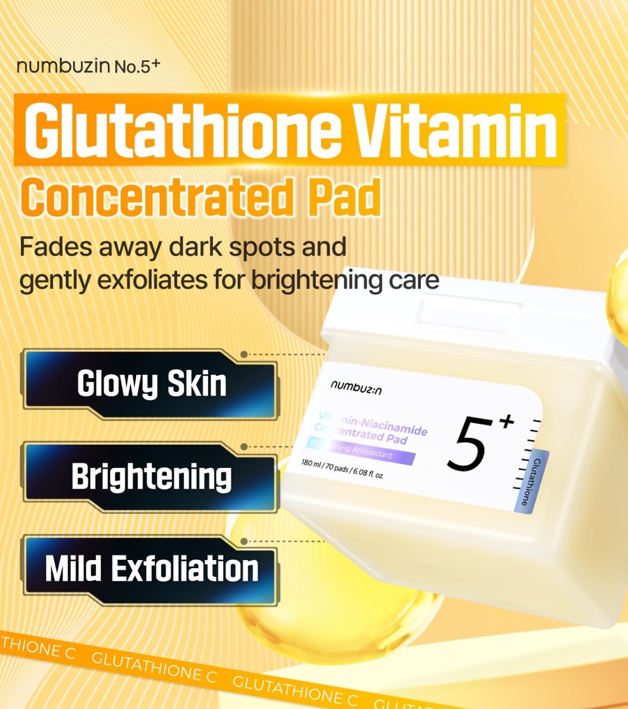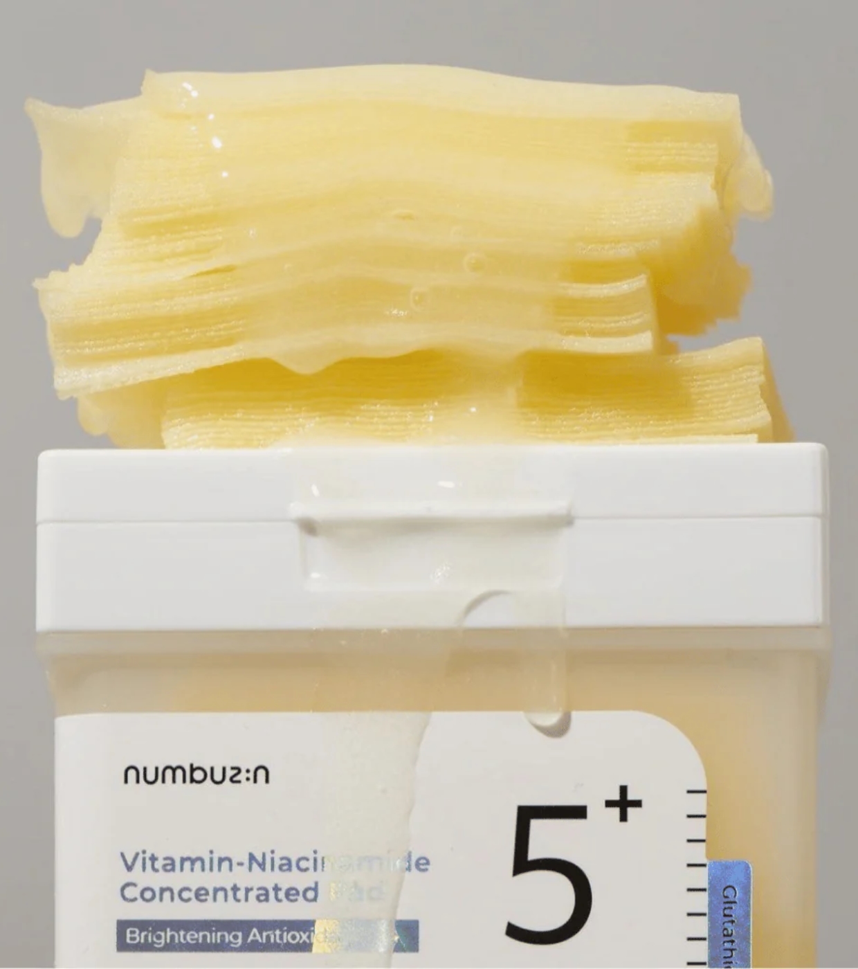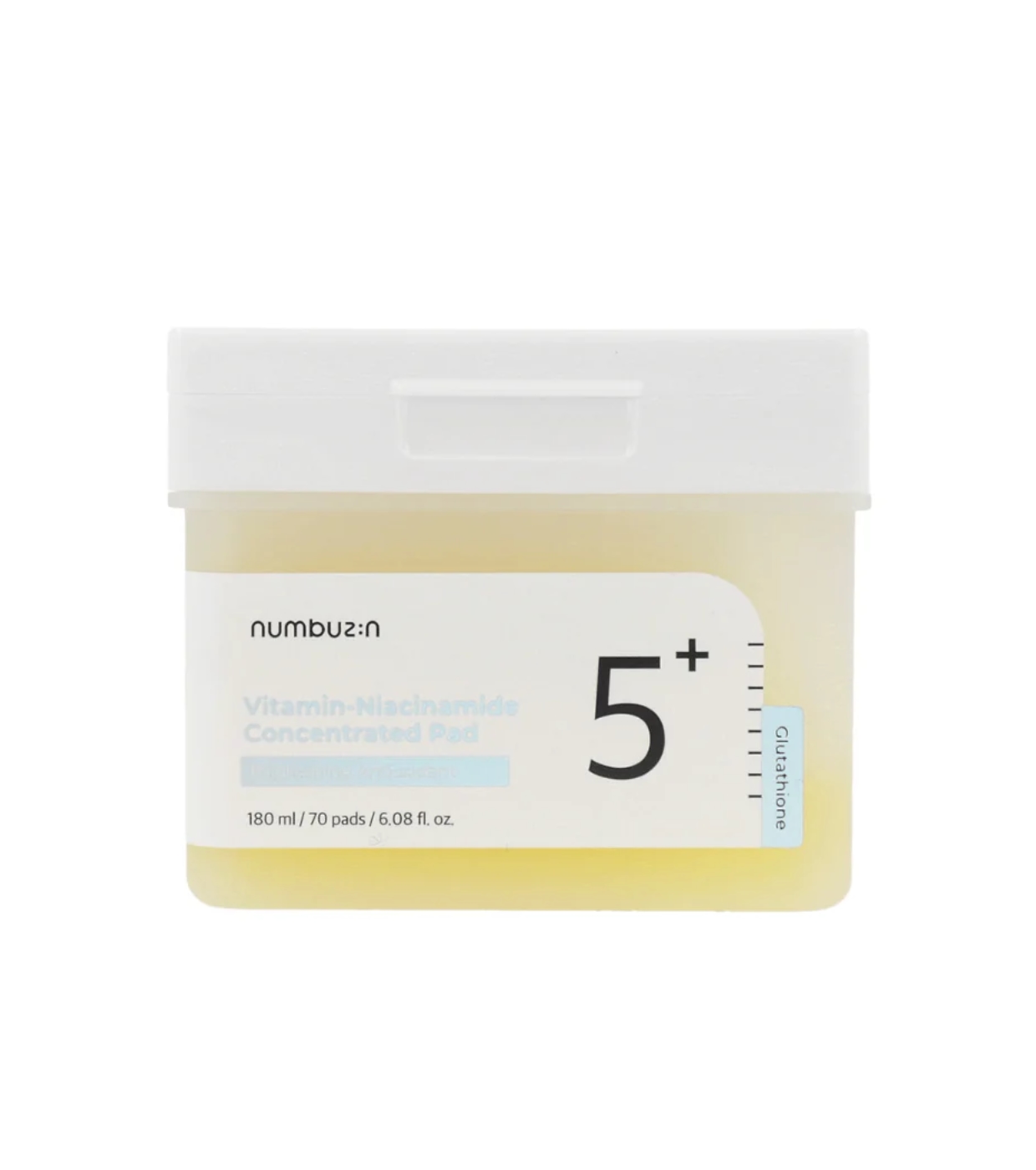 No.5+ Vitamin-Niacinamide Numbuzin Konzentrierte Pads enthalten eine leistungsstarke Mischung aus Vitamin C, Niacinamid und Vitamin E, um die Haut aufzuhellen, dunkle Flecken zu reduzieren und die Hautstruktur zu verbessern.