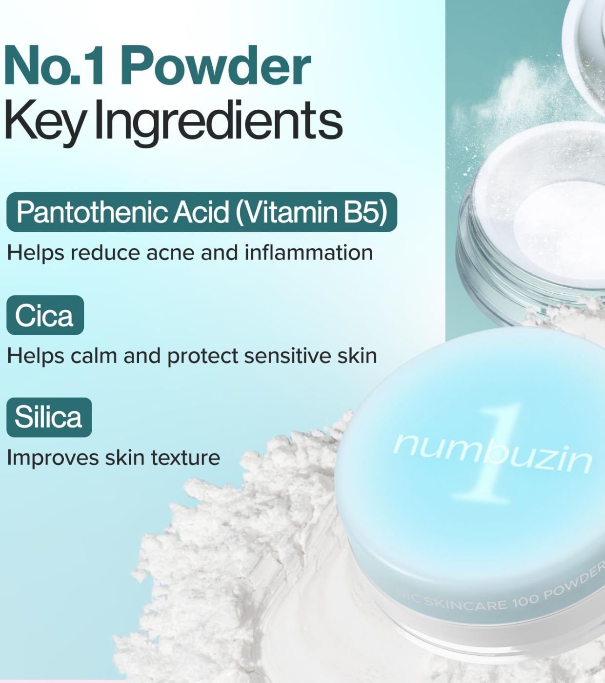 Erhalten Sie eine glatte, glanzfreie und gepflegte Haut mit dem mattierenden Puder No.1 Pantothenic Skincare 100 von Numbuzin, einem mattierenden Puder, der nicht nur das Finish Ihres Make-ups perfektioniert, sondern auch Ihre Haut pflegt.