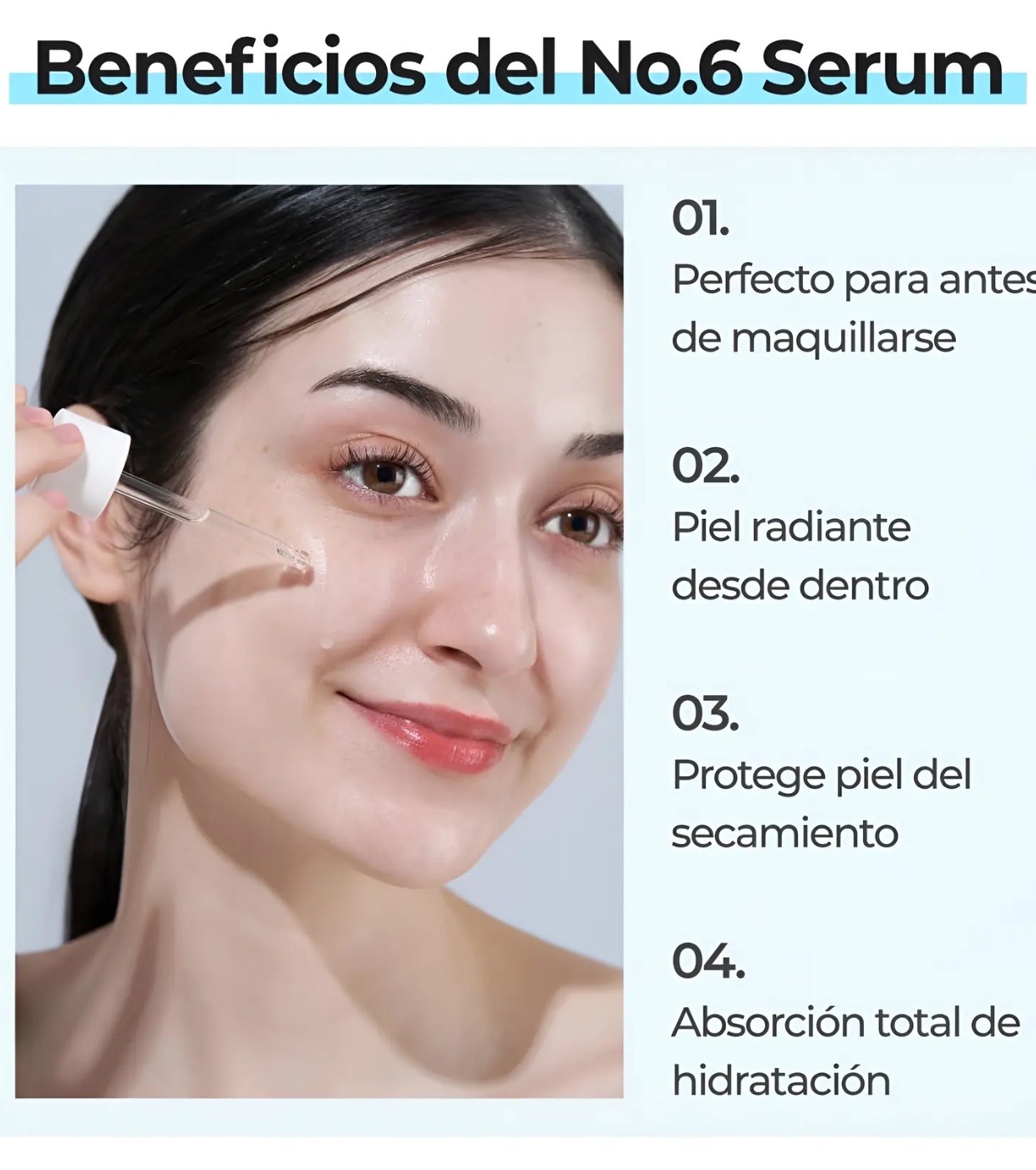 - Mehrstufige Feuchtigkeitsversorgung: Nr. 6 enthält einen Komplex aus fünf Hyaluronsäuretypen, der in alle Hautschichten eindringt, von der Oberfläche bis in die tiefsten Schichten, und so für umfassende Feuchtigkeitsversorgung sorgt und Linien und Fältchen glättet.