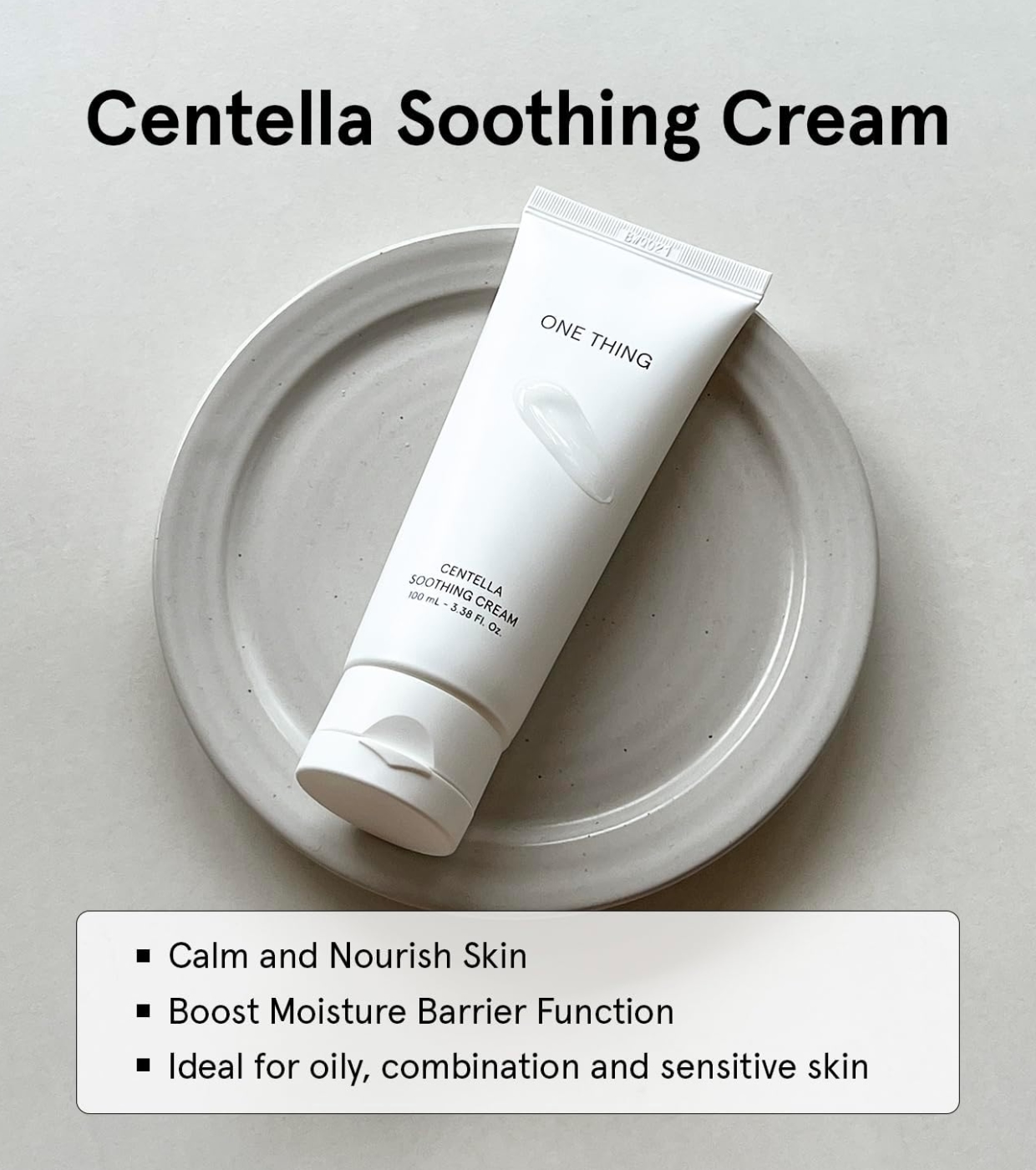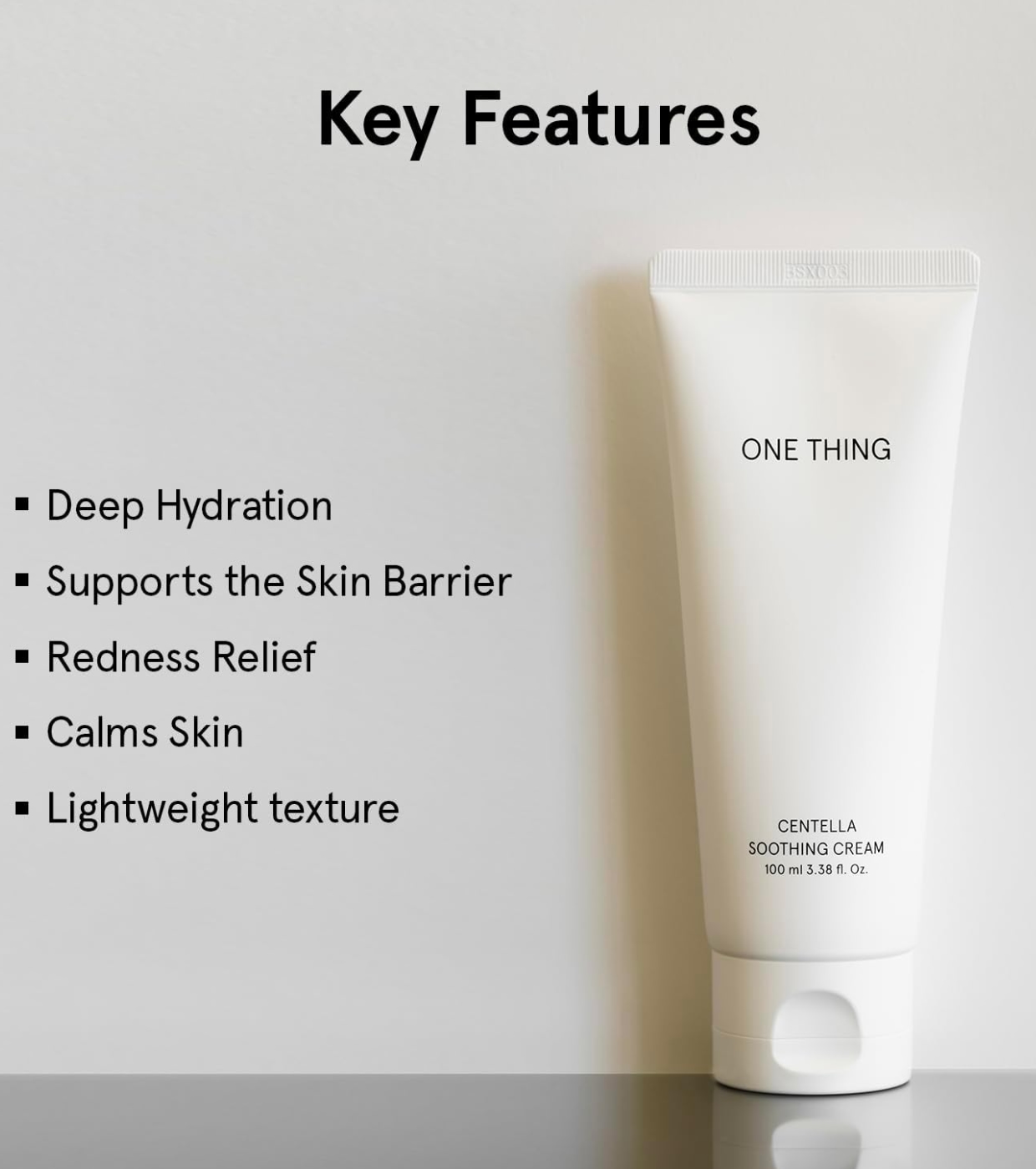 Die Centella Soothing Cream von One Thing ist eine leichte Feuchtigkeitscreme, die entwickelt wurde, um durch äußere Einflüsse verursachte Hautreizungen zu lindern und der Haut sofortigen Komfort zu bieten.