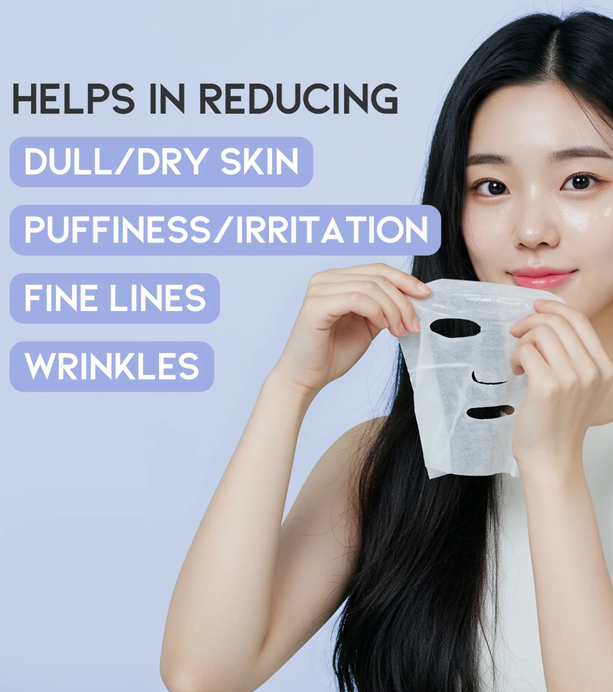 Nehmen Sie die Maske aus der Verpackung und verteilen Sie sie gleichmäßig auf Ihrem Gesicht. Sparen Sie dabei den Augen- und Mundbereich aus.