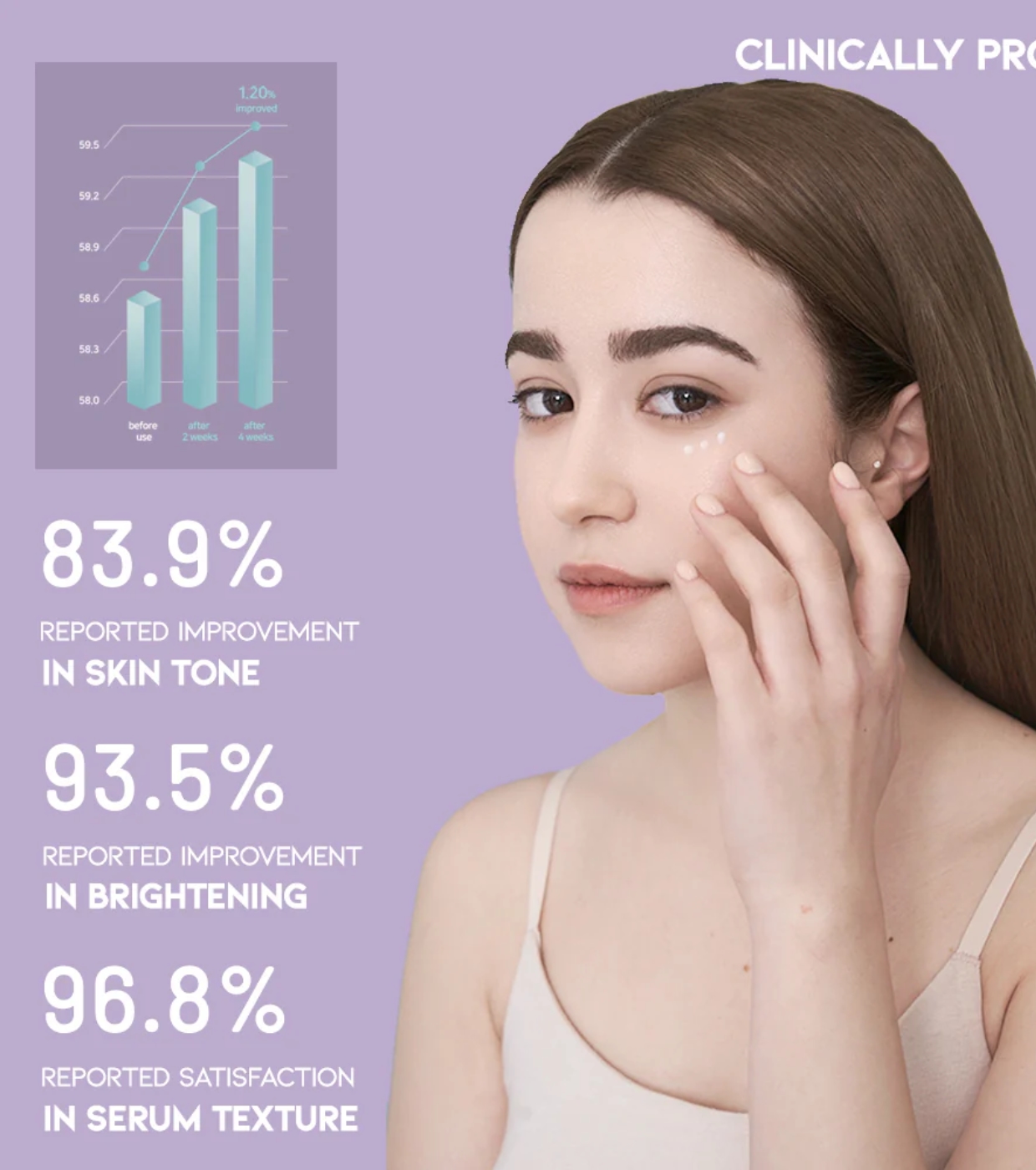 - Vitamin C – Hellt den Hautton auf, gleicht ihn aus und reduziert das Auftreten dunkler Ringe.