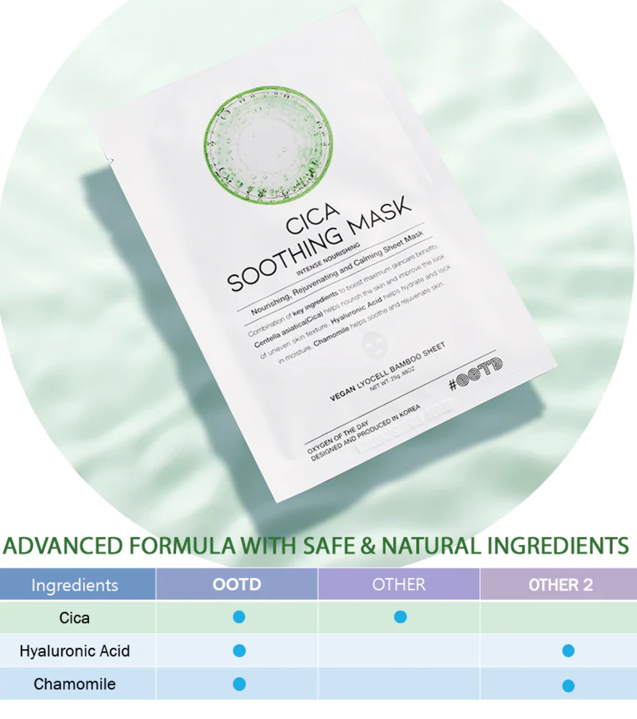 Diese Maske wurde speziell für empfindliche und problematische Haut entwickelt und vereint die beruhigende Kraft von Centella Asiatica (Cica), Hyaluronsäure und Kamille, um die Haut mit Feuchtigkeit zu versorgen, zu regenerieren und zu straffen, sodass sie strahlender, verjüngt und gesünder aussieht.