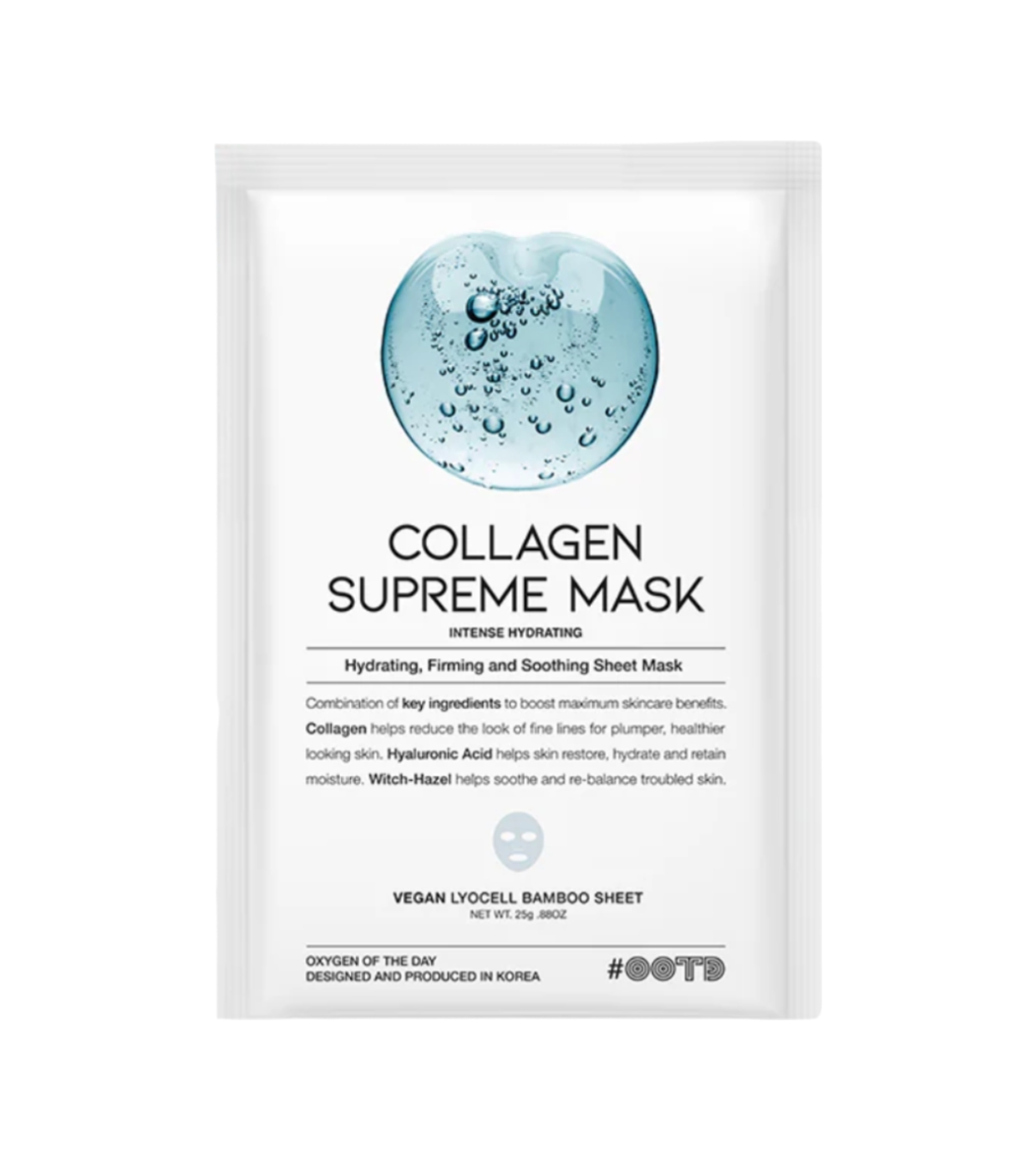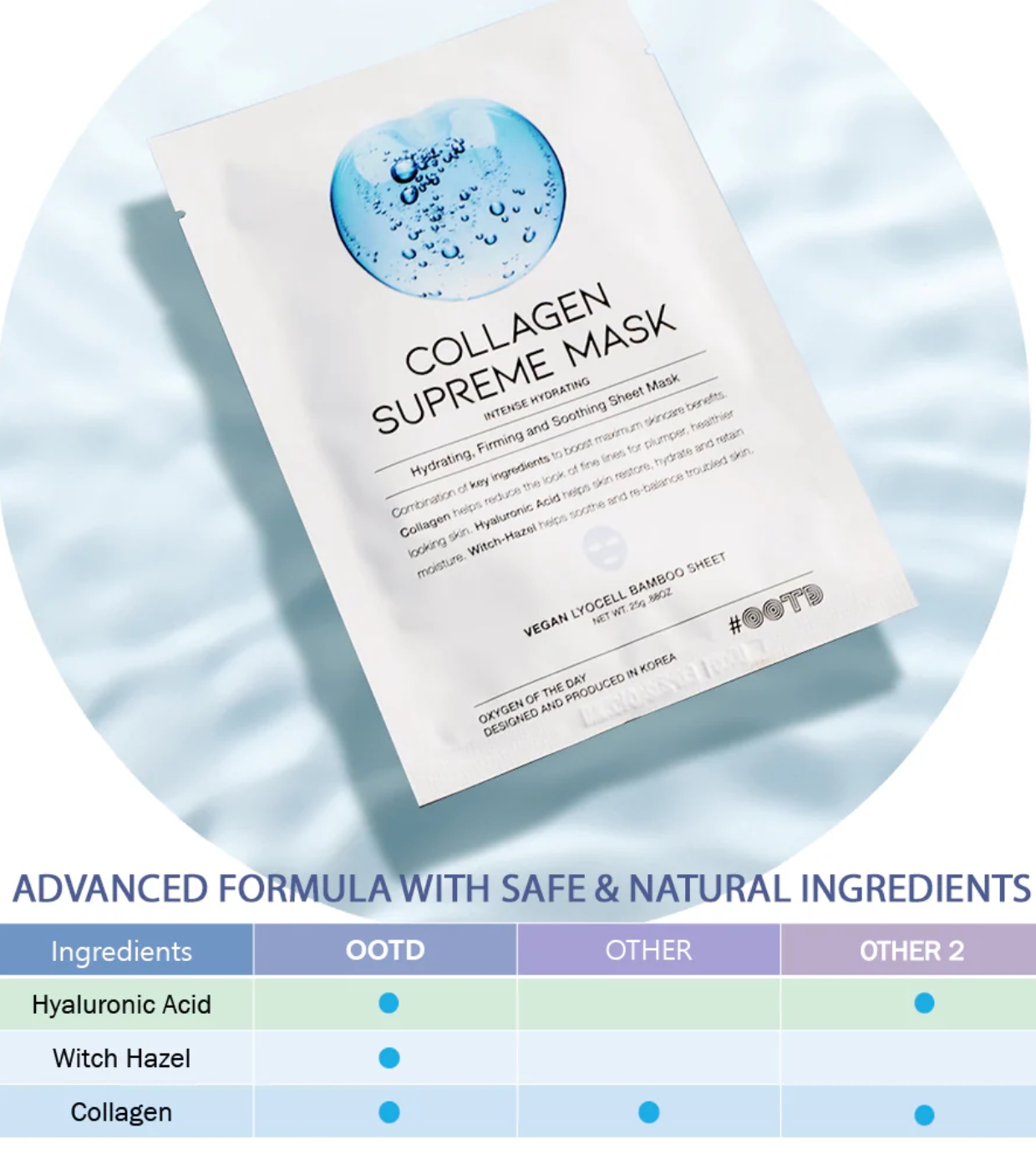 Revitalisieren Sie Ihre Haut mit unserer regenerierenden Gesichtsmaske Collagen Supreme Mask von OOTD Beauty , die mit einer leistungsstarken Kombination aus Kollagen, Hyaluronsäure und Hamamelis für eine umfassende Pflege formuliert ist.