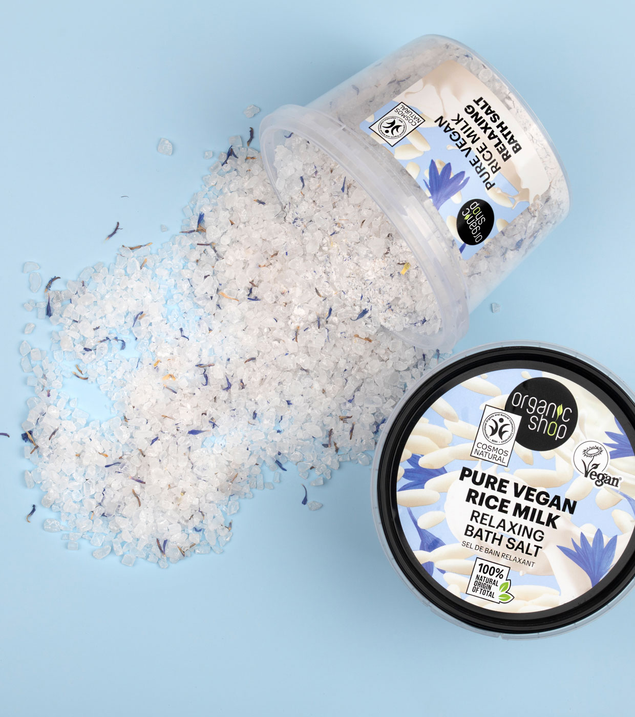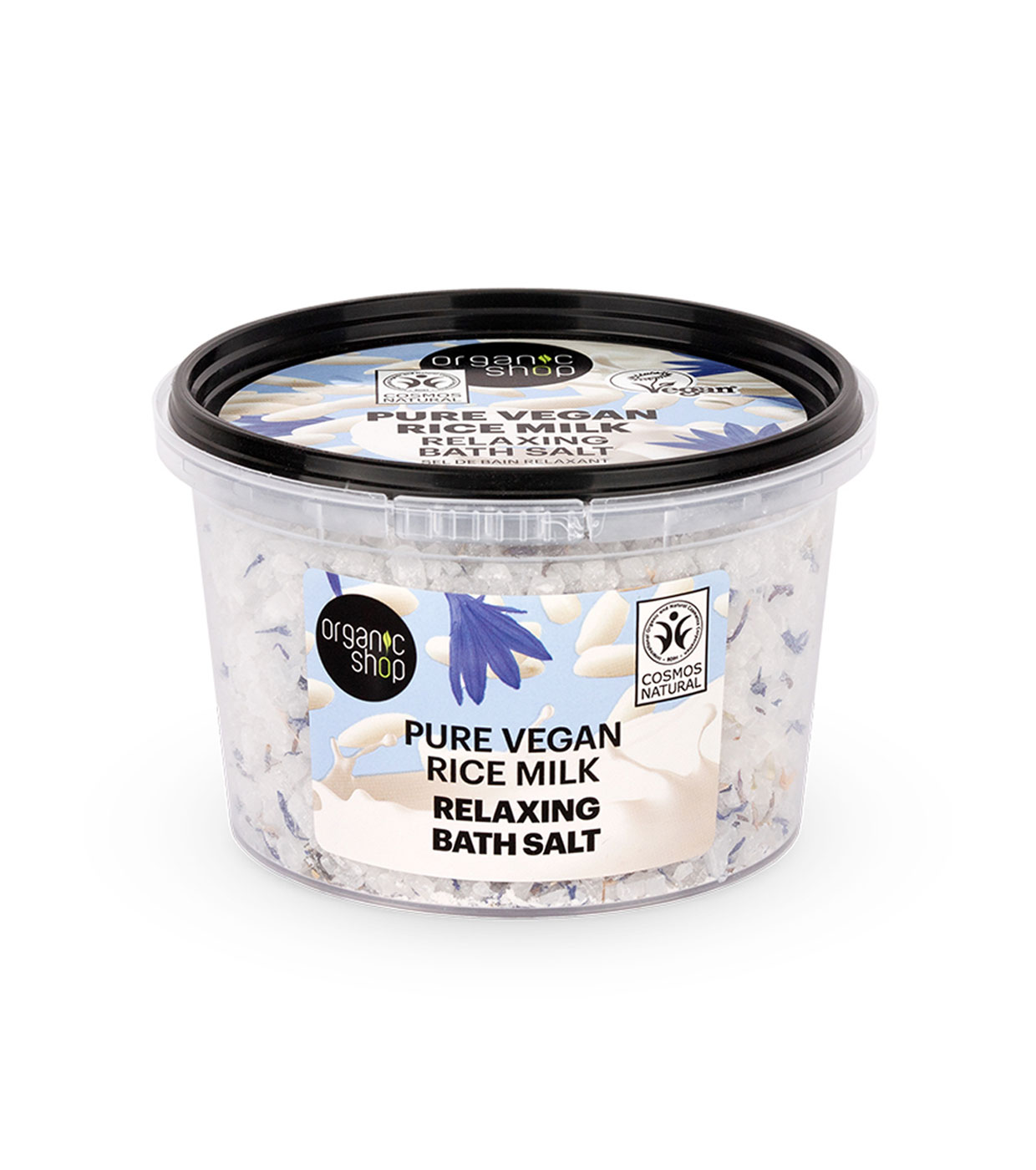 Tauchen Sie ein in ein Spa-Erlebnis ganz bequem zu Hause mit dem entspannenden Reismilch-Badesalz von Organic Shop..