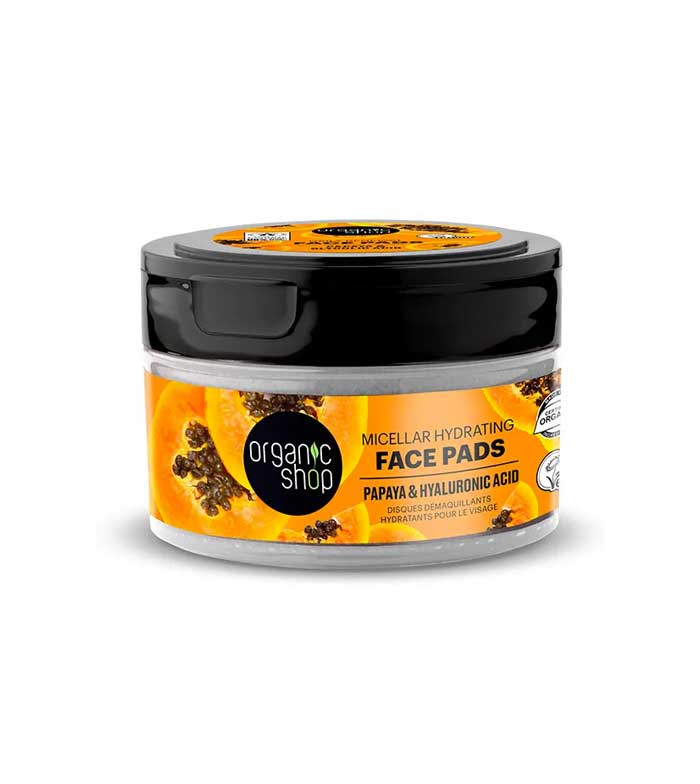 Organic Shop Feuchtigkeitsspendende Abschmink-Gesichtspads mit Papaya-Extrakt und Hyaluronsäure.