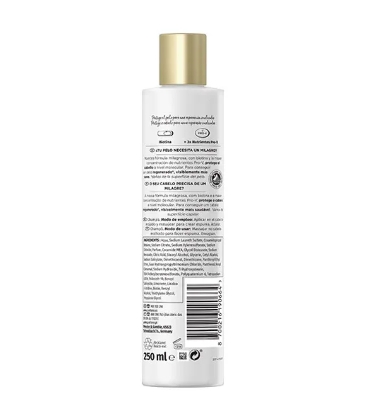 Aqua, Sodium Laureth Sulfate, Cocamidopropyl Betaine, Sodium Citrate, Sodium Xylenesulfonate, Sodium Chloride, Parfum, Cocamide MEA, Glycol Distearate, Sodium Benzoate, Citric Acid, Stearyl Alcohol, Glycerin, Cetyl Alcohol, Sodium Salicylate, Dimethiconol, Dimethicone, Panthenyl Ethyl Ether, Guar Hydroxypropyltrimonium Chloride, Panthenol, Hexyl Cinnamal, Sodium Hydroxide, Trihydroxystearin, TEA-Dodecylbenzenesulfonate, Polyquaternium-6, Tetrasodium EDTA, Trideceth-10, Benzyl Salicylate, Limonene, Linalool, Histidine, Biotin, Benzyl Alcohol, Triethylene Glycol, Propylene Glycol