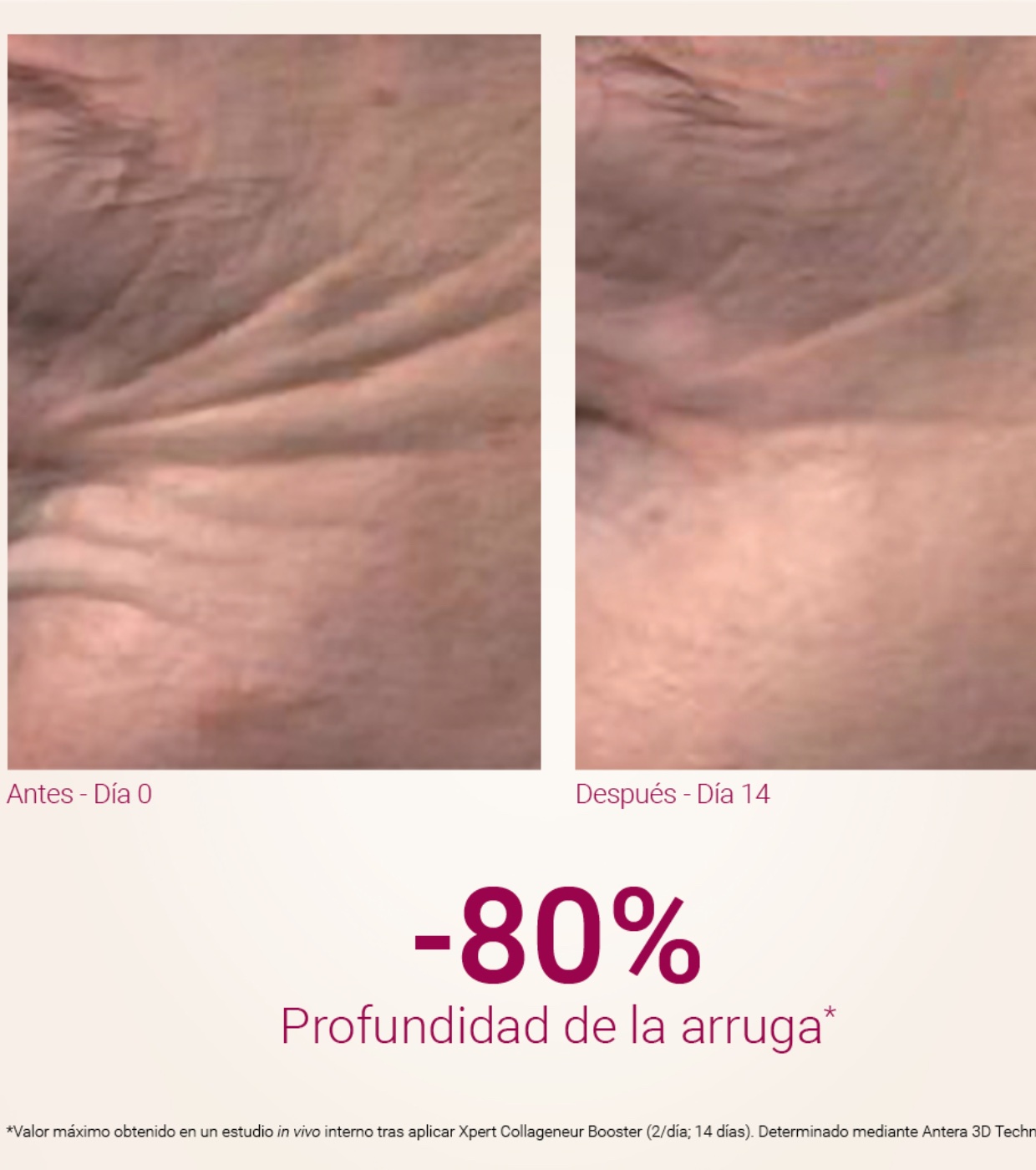 Dieses Konzentrat wirkt direkt auf tiefe Falten, schlaffe und fahle Haut und erreicht laut klinischen In-vivo-Studien eine Reduzierung der Faltenerscheinung um bis zu 80 % in nur 14 Tagen.