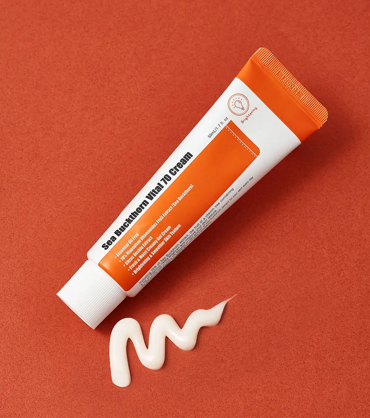 Diese Creme enthält 70% Sanddorn-Extrakt, der dazu beiträgt, die Hautstruktur sichtbar aufzuhellen und zu glätten.