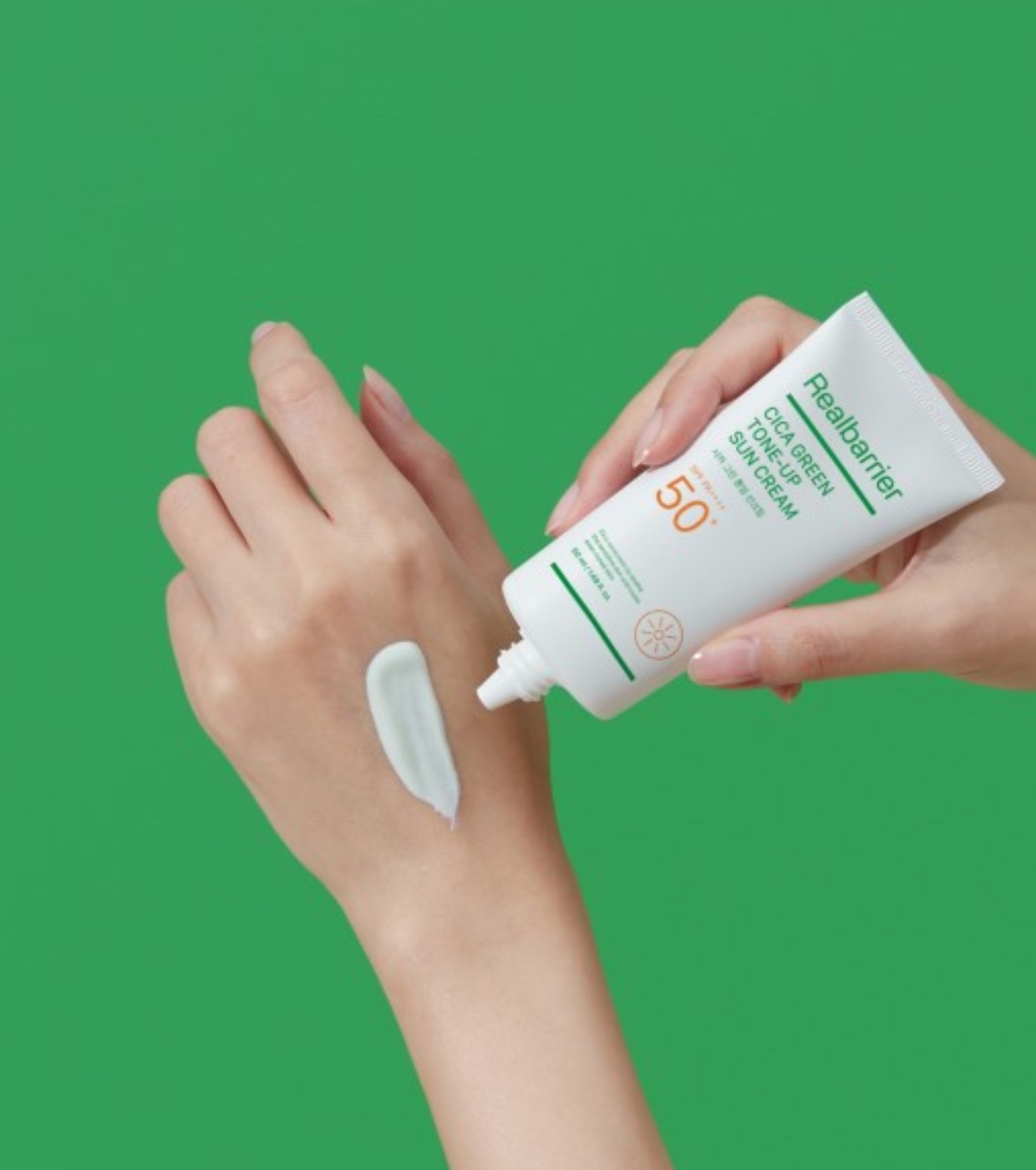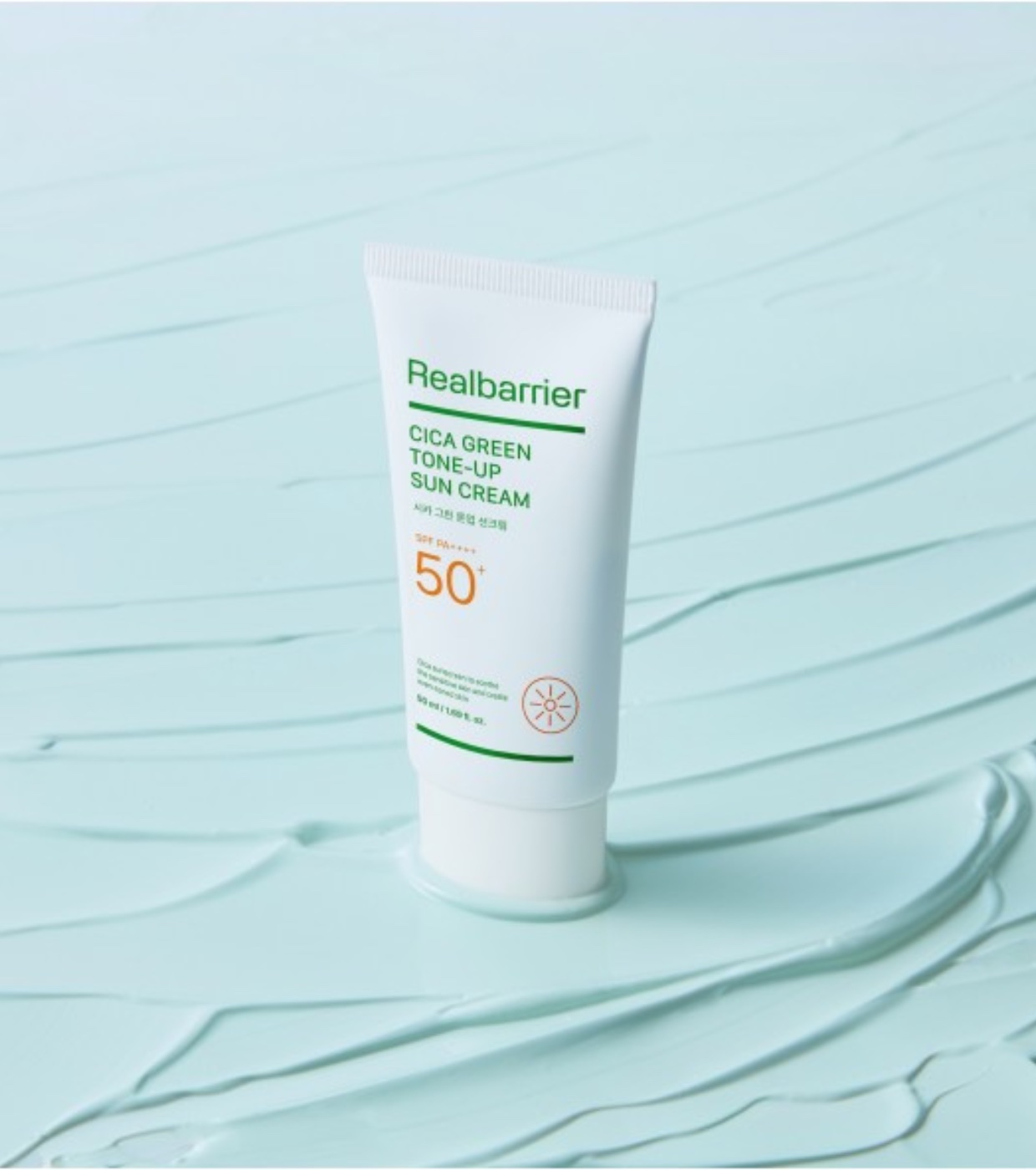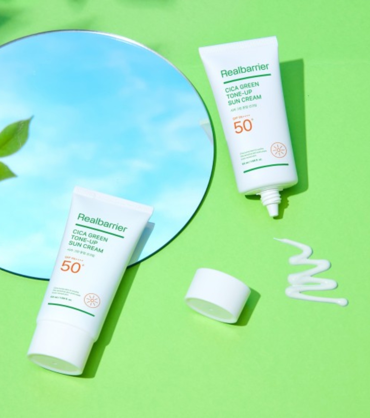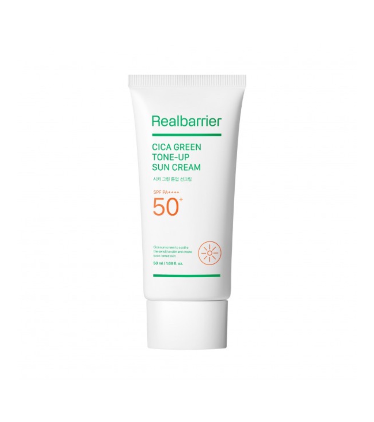 Real Barrier Cica Green Tone-Up ist ein grün getönter mineralischer Sonnenschutz für empfindliche und gerötete Haut.