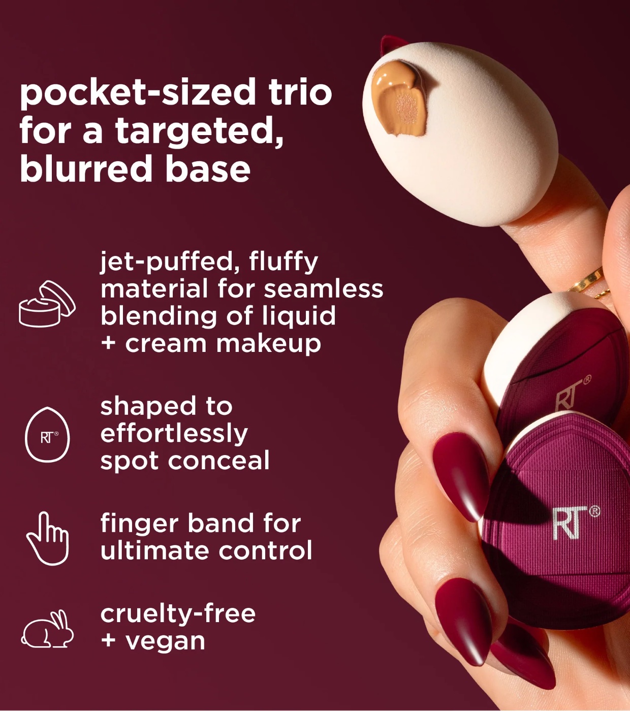 Das 3er-Pack Mini-Schwamm-Trio von Real Techniques enthält drei superweiche Mini-Make-up-Quasten, um Unreinheiten makellos zu kaschieren und eine verblendbare Grundierung zu erzeugen.