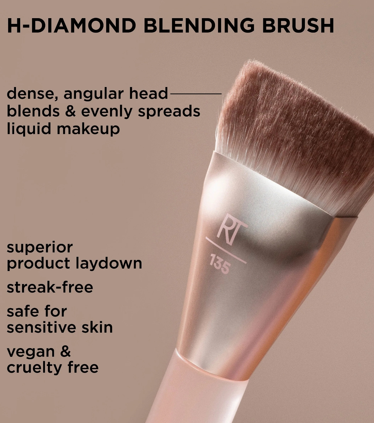 Der New Nudes 2.0 H-Diamond Blending von Real Techniques zeichnet sich durch seinen einzigartigen dichten, abgewinkelten, diamantförmigen Pinselkopf aus, der für ein präzises und einfaches Auftragen und Verblenden von Make-up entwickelt wurde.