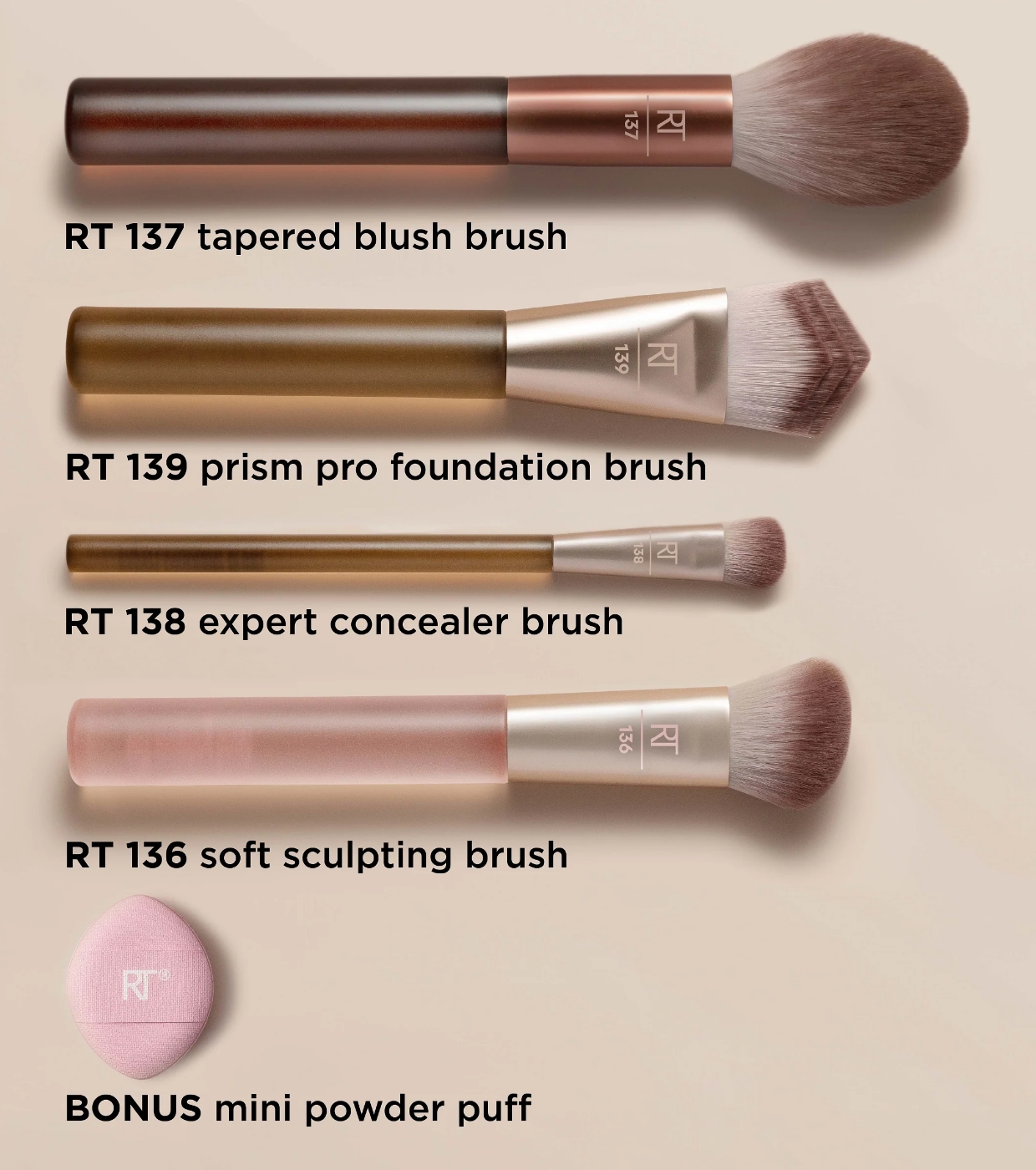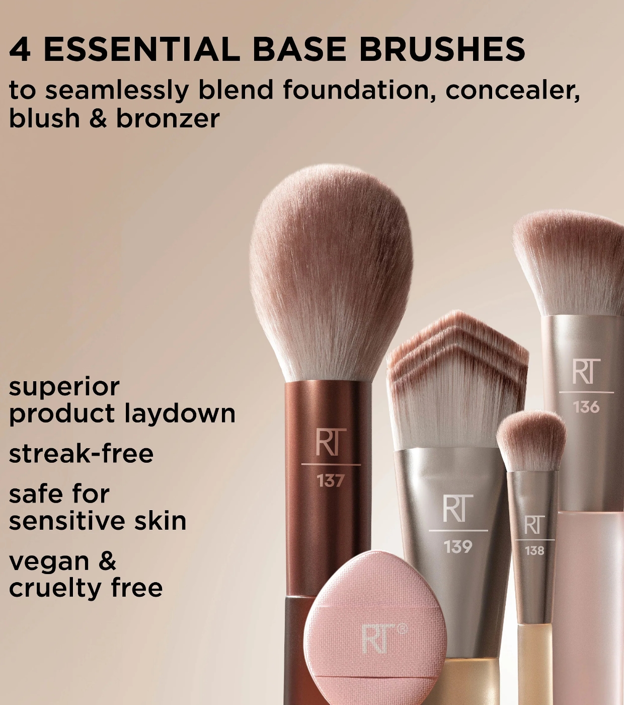 Die Pinsel eignen sich perfekt für flüssige, cremige und pudrige Produkte wie Foundation, Konturpuder, Bronzer, Concealer oder Rouge und ermöglichen ein gleichmäßiges Verblenden sowie ein natürliches, airbrush-ähnliches Finish.