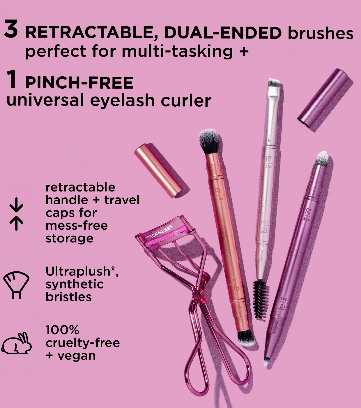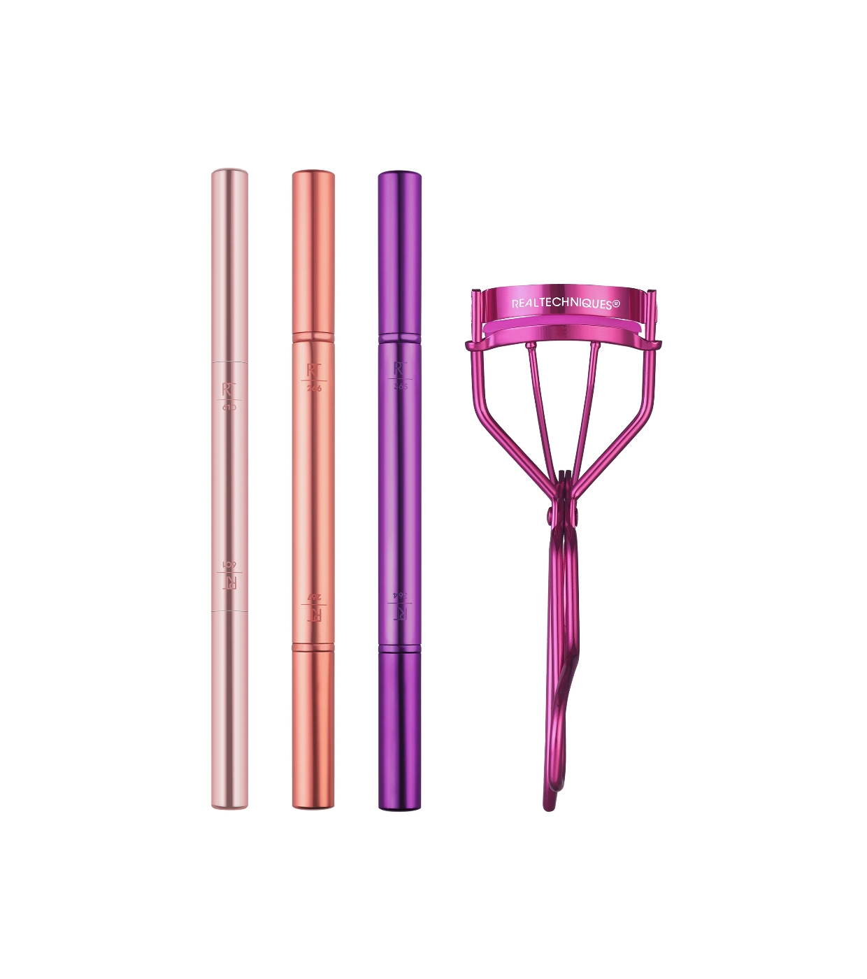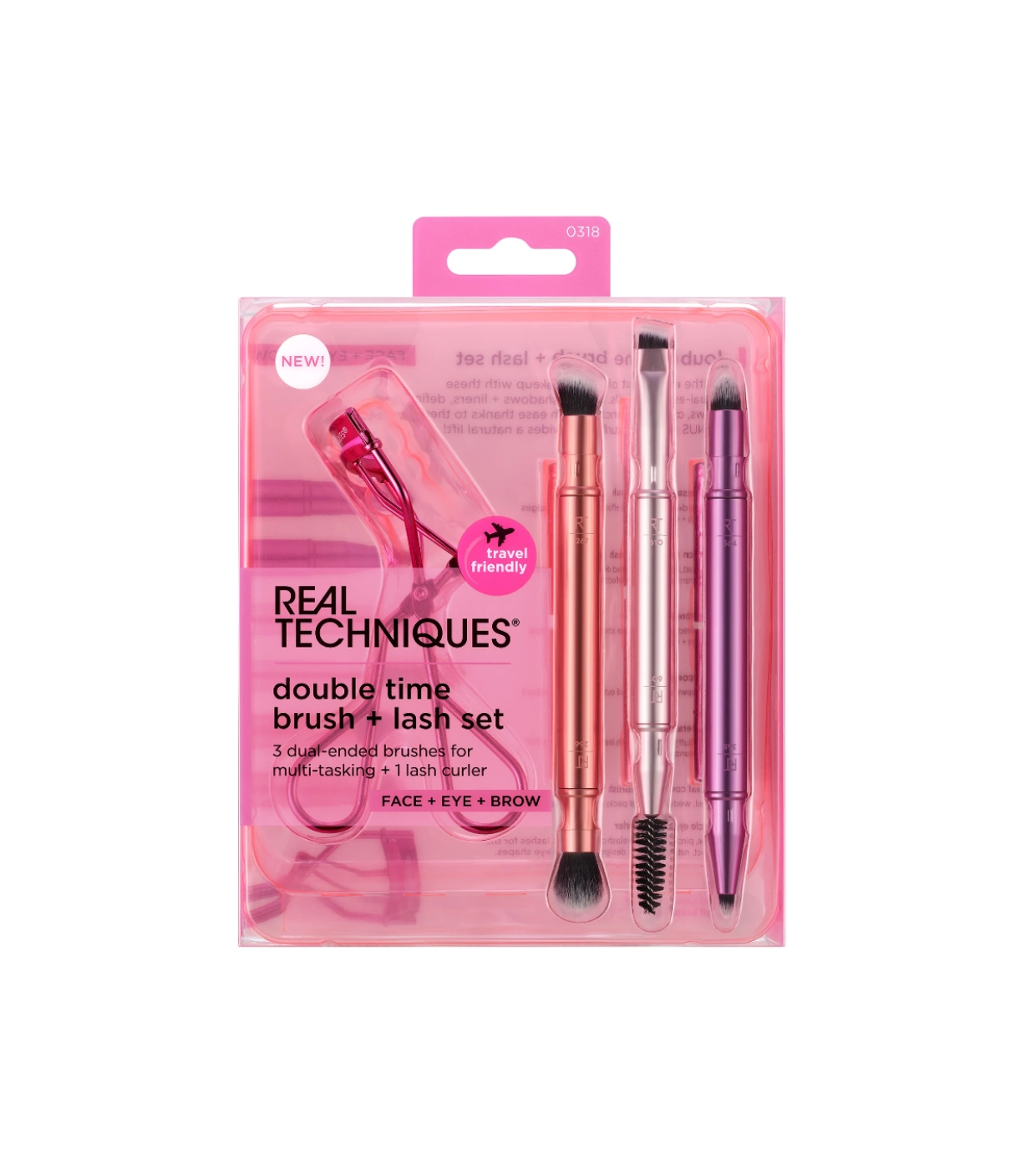 Dieses All-in-One-Reiseset Double Time Brush + Lash set Real Techniques enthält 3 doppelseitige Pinsel und eine Miracle-Wimpernzange, perfekt zum Definieren, Verblenden und Perfektionieren Ihrer Augen unterwegs.
