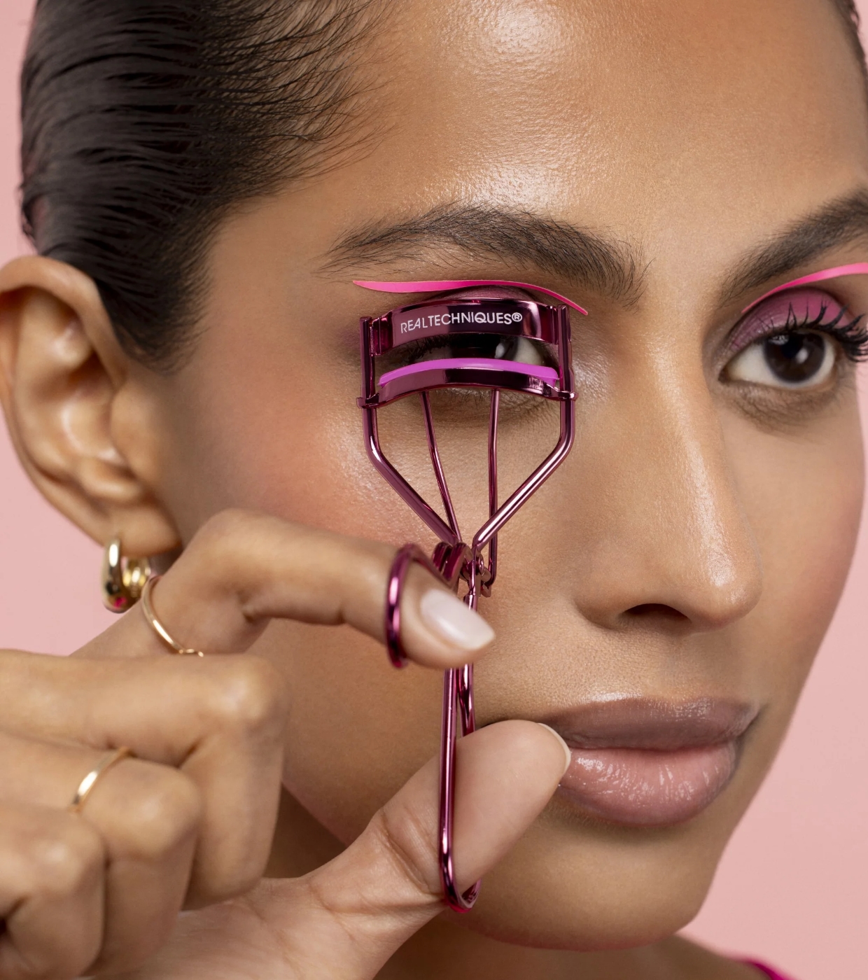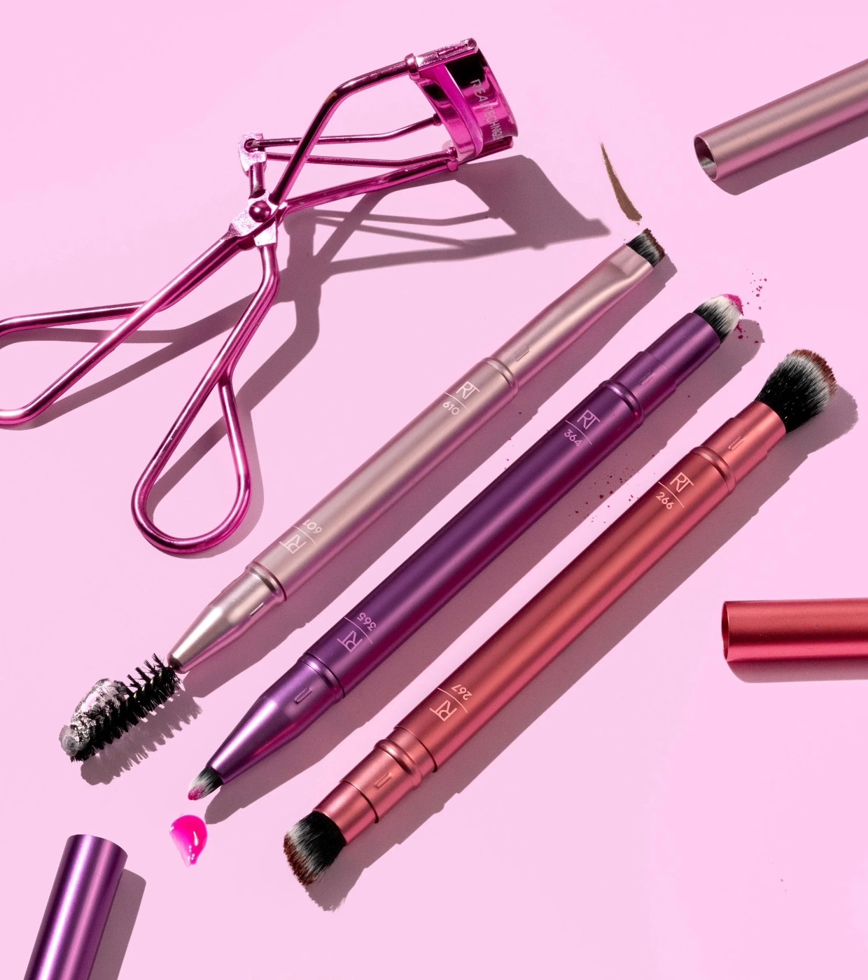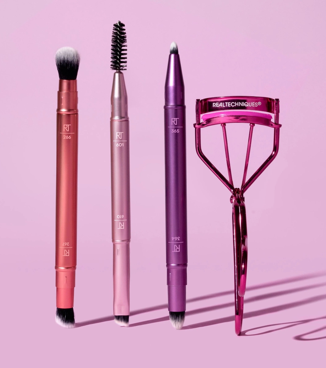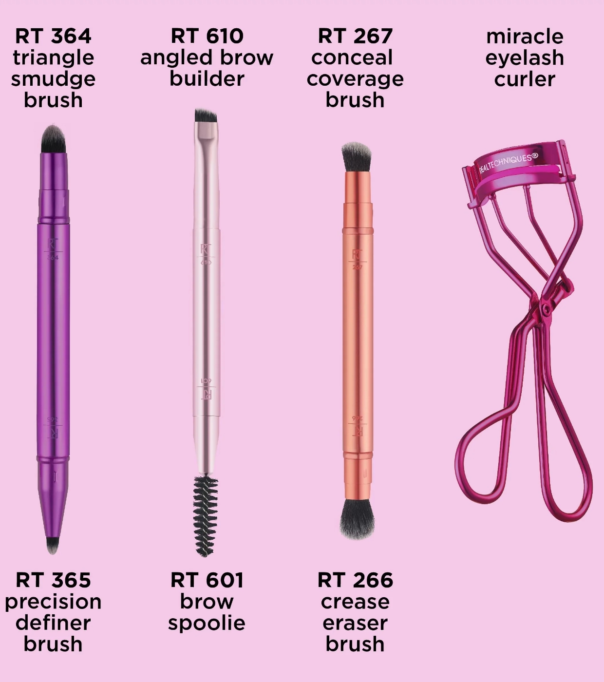 Dieses All-in-One-Reiseset Double Time Brush + Lash set Real Techniques enthält 3 doppelseitige Pinsel und eine Miracle-Wimpernzange, perfekt zum Definieren, Verblenden und Perfektionieren Ihrer Augen unterwegs.