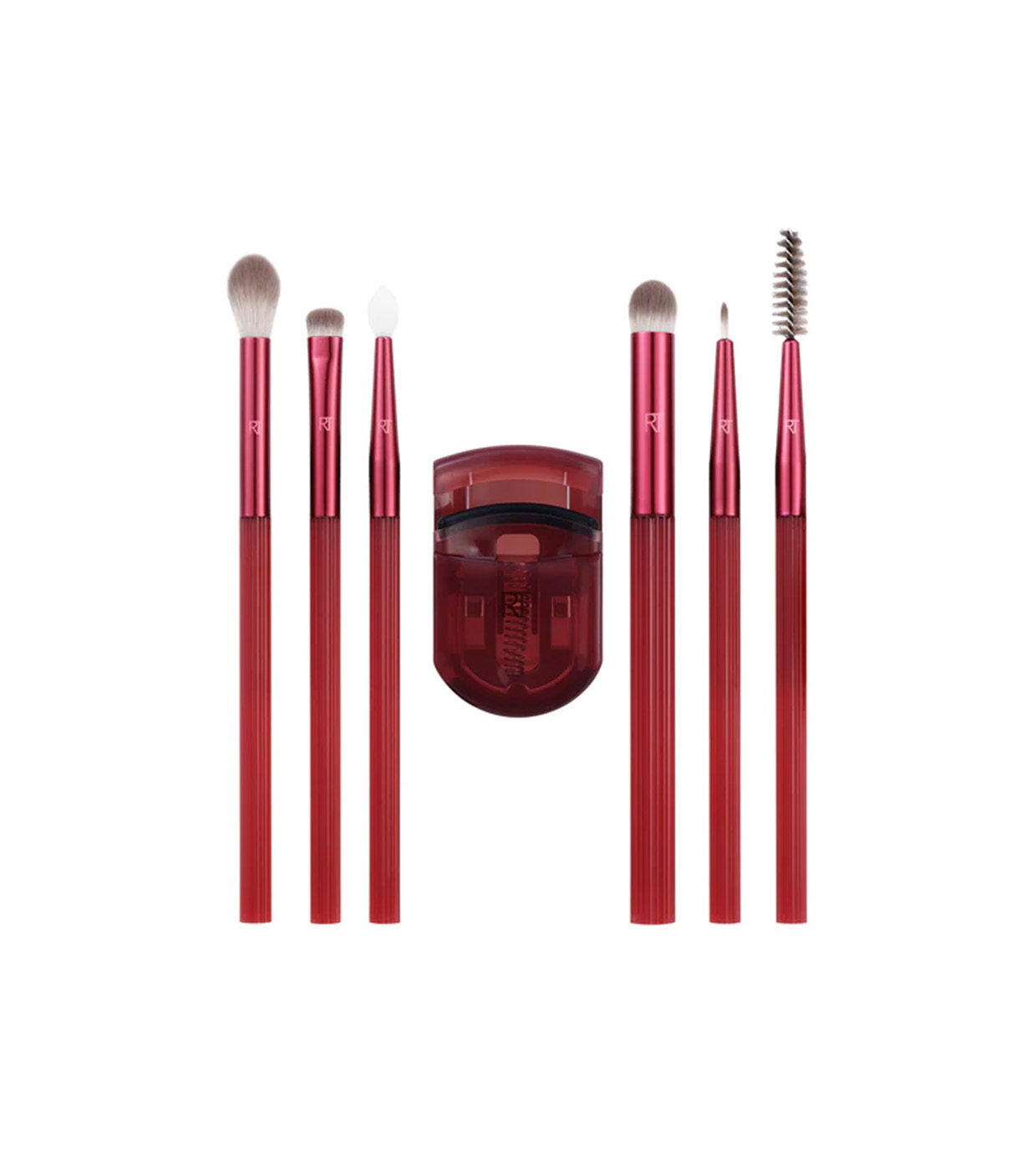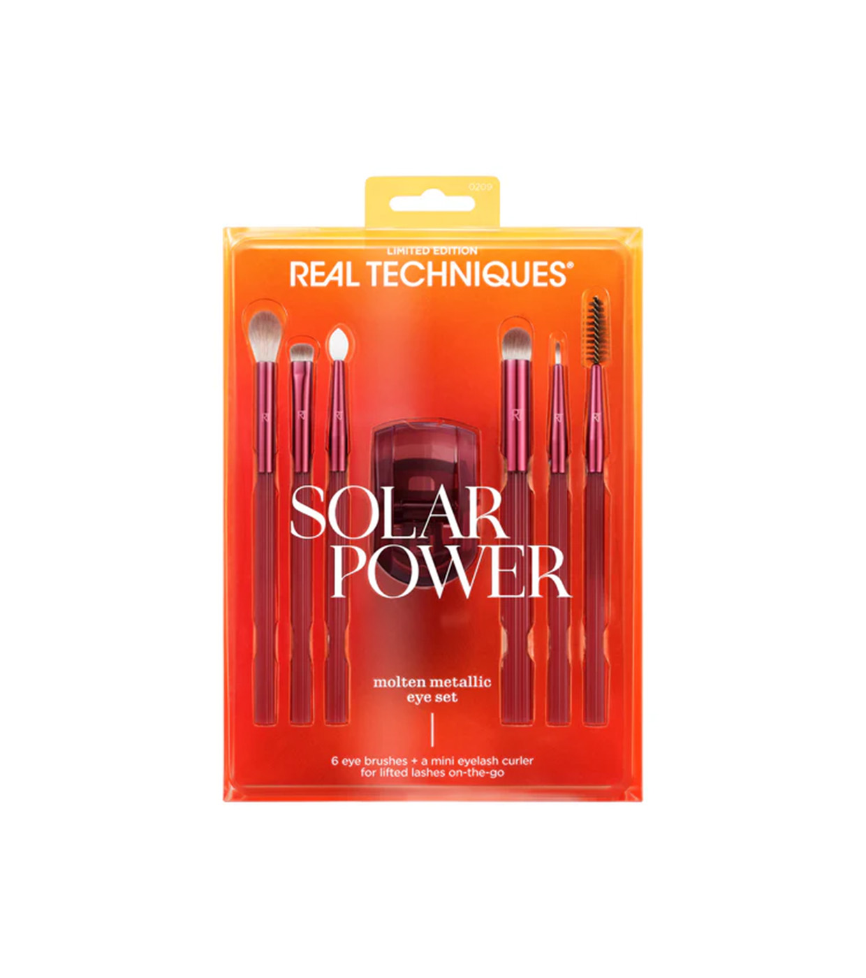 Das Real Techniques Solar Power Molten Metallic Eye Set enthält 6 pigmentierte Augenpinsel und eine Mini-Wimpernzange, mit der Sie Ihre Wimpern unterwegs anheben können.