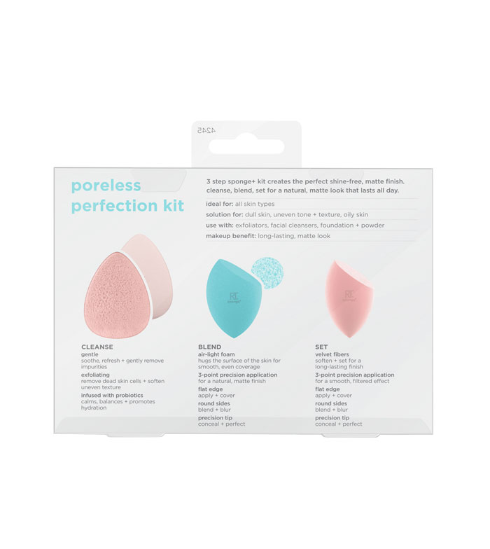 Das Poreless Perfection Kit Schwamm-Set aus der Sponge + Collection von Real Techniques hilft Ihnen, in nur 3 Schritten eine glatte, matte Basis zu schaffen.