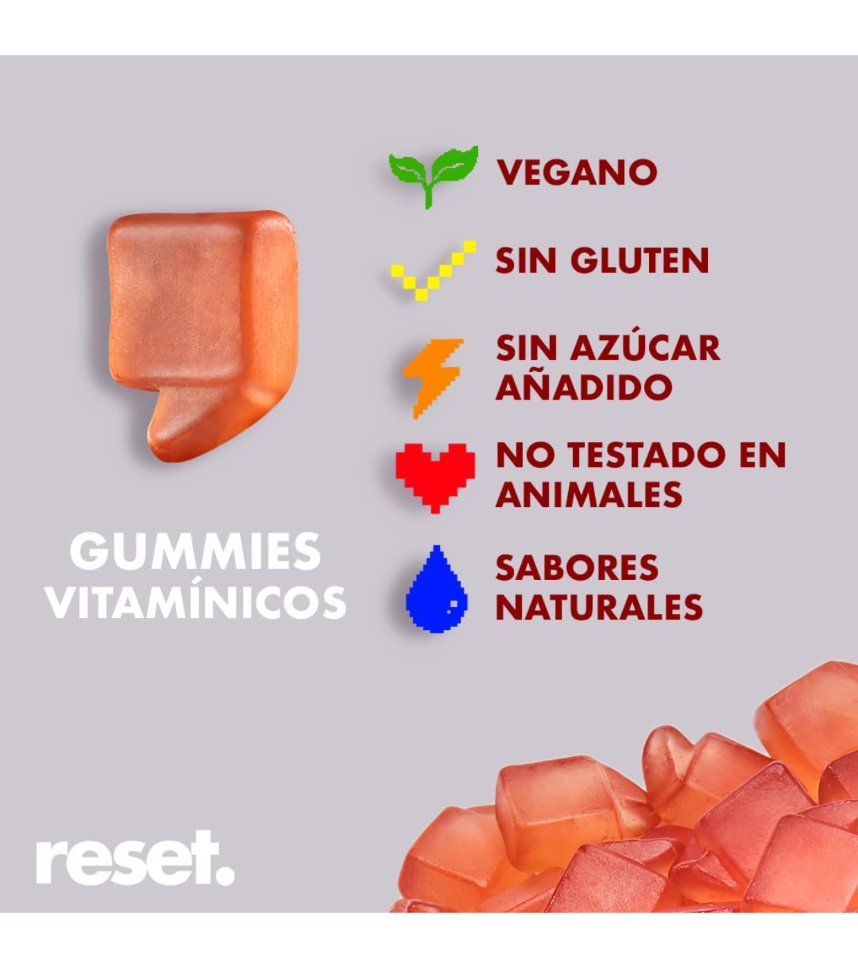 Fructooligosacáridos(FOS), agua, gelificante (pectina), ácido L-ascórbico (vitamina C), acidulante (ácido cítrico), extracto de arroz (Oryza sativa L., semillas), coenzima Q10, corrector de acidez (citrato de sodio), aceite de coco (cocos nucifera L), aroma natural, colorante (extracto de pimentón), agente de recubrimiento (cera de carnauba).
