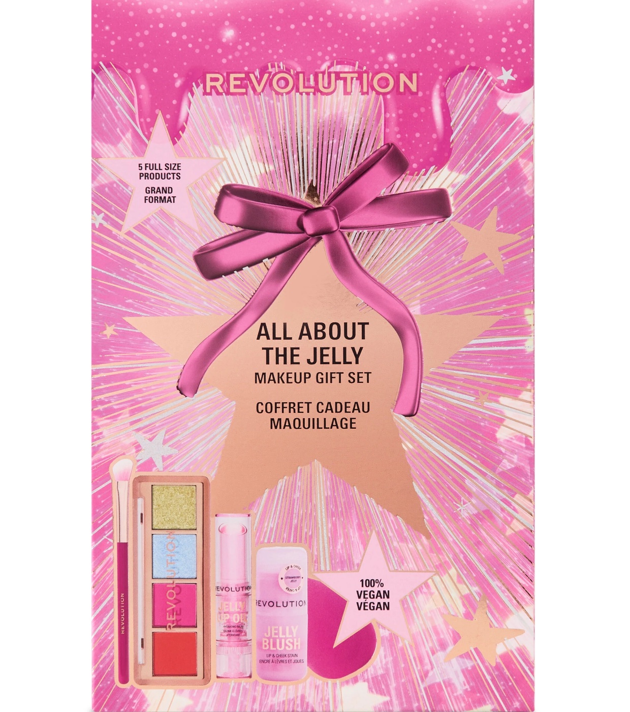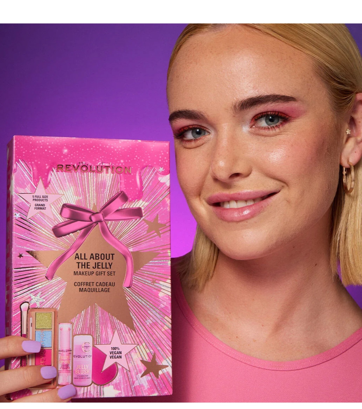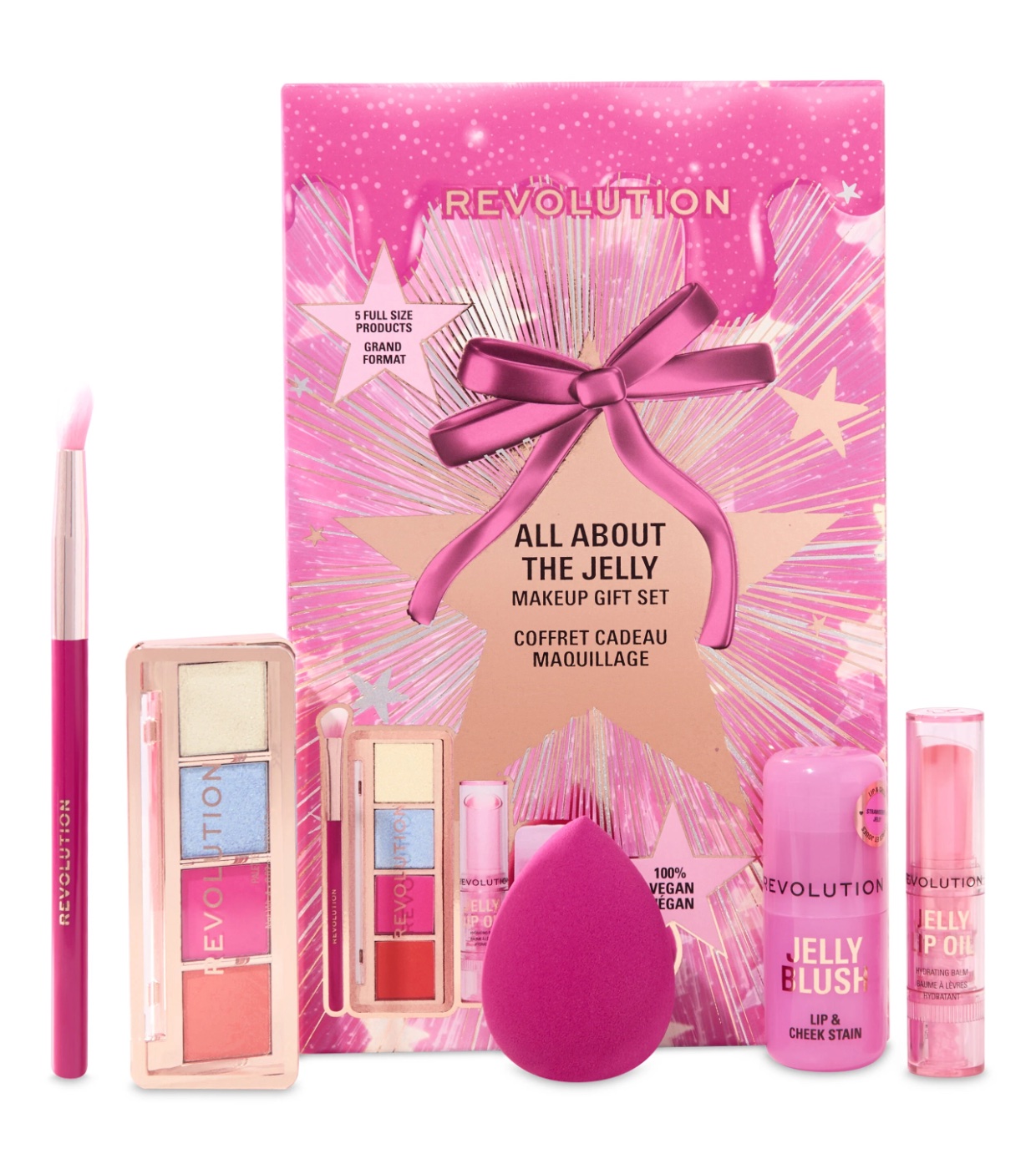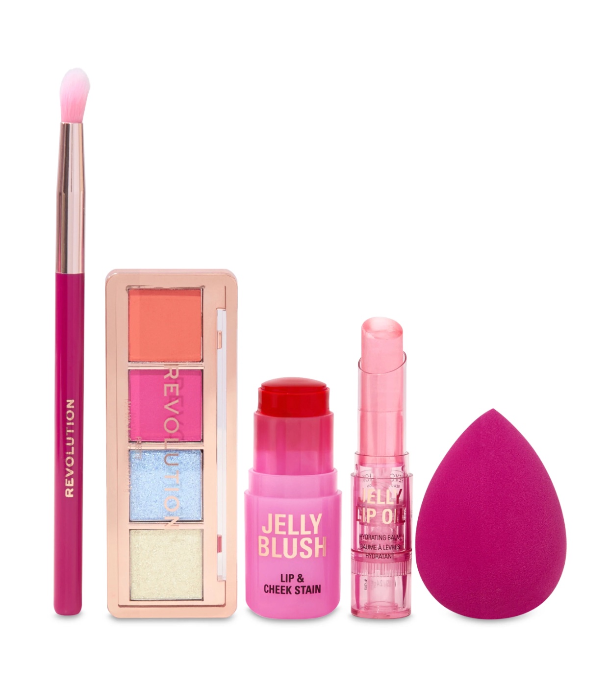 REVOLUTION HIGHLIGHTER STICK JELLY GLOW (INGREDIENTS): AQUA (WATER, EAU), GLYCERIN, SORBITOL, PROPYLENE GLYCOL, CALCIUM ALUMINUM BOROSILICATE, AGAROSE, XANTHAN GUM, PEG-40 HYDROGENATED CASTOR OIL, PHENOXYETHANOL, PARFUM (FRAGRANCE), ETHYLHEXYLGLYCERIN, CAPRYLYL GLYCOL, TIN OXIDE, SYNTHETIC FLUORPHLOGOPITE, VANILLIN, CI 77891 (TITANIUM DIOXIDE), CI 16035 (RED 40 LAKE). REVOLUTION BEAM BRIGHT HIGHLIGHTER GOLDEN GAL (INGREDIENTS): MICA, MAGNESIUM ALUMINUM SILICATE, HYDROGENATED POLYISOBUTENE, BORON NITRIDE, DIMETHICONE, SILICA, PENTAERYTHRITYL TETRAISOSTEARATE, CAPRYLIC/CAPRIC TRIGLYCERIDE, TRIDECYL STEARATE, PHENOXYETHANOL, CETEARETH-20, CAPRYLYL GLYCOL, BIS-DIGLYCERYL POLYACYLADIPATE-2, TRIETHOXYCAPRYLYLSILANE, CI 77891 (TITANIUM DIOXIDE), CI 77491 (IRON OXIDES). REVOLUTION THE MINI ENCHANTED ICON PALETTE (INGREDIENTS): PRESSED PIGMENTS SHADE 2: MICA, SILICA, BORON NITRIDE, DIMETHICONE, HYDROGENATED POLYISOBUTENE, MAGNESIUM STEARATE, POLYETHYLENE, PENTAERYTHRITYL TETRAISOSTEARATE, TRIETHOXYCAPRYLYLSILANE, PHENOXYETHANOL, CAPRYLYL GLYCOL, DIETHYLHEXYL SYRINGYLIDENEMALONATE, CAPRYLIC/CAPRIC TRIGLYCERIDE CI 15850 (RED 7 LAKE), CI 16035 (RED 40 LAKE), CI 77491 (IRON OXIDES), CI 77499 (IRON OXIDES), CI 45410 (RED 28 LAKE), CI 77891 (TITANIUM DIOXIDE). SHADE 3: CALCIUM ALUMINUM BOROSILICATE, DIMETHICONE, HYDROGENATED POLYISOBUTENE, MICA, MAGNESIUM STEARATE, SILICA, POLYETHYLENE, PENTAERYTHRITYL TETRAISOSTEARATE, PHENOXYETHANOL, TIN OXIDE, CAPRYLYL GLYCOL, DIETHYLHEXYL SYRINGYLIDENEMALONATE, CAPRYLIC/CAPRIC TRIGLYCERIDE, CI 77891 (TITANIUM DIOXIDE), CI 16035 (RED 40 LAKE), CI 77499 (IRON OXIDES), CI 15985 (YELLOW 6 LAKE). EYESHADOWS SHADE 1: HYDROGENATED POLYISOBUTENE, CAPRYLIC/CAPRIC TRIGLYCERIDE, ISONONYL ISONONANOATE, CERA MICROCRISTALLINA (MICROCRYSTALLINE WAX, CIRE MICROCRISTALLINE), SILICA, BIS-DIGLYCERYL POLYACYLADIPATE-2, SYNTHETIC WAX (CIRE SYNTHETIQUE), MICA, COPERNICIA CERIFERA WAX (CARNAUBA WAX, CIRE DE CARNAUBA), TRIETHOXYCAPRYLYLSILANE, PHENOXYETHANOL, TOCOPHERYL ACETATE, CAPRYLYL GLYCOL, CI 77491 (IRON OXIDES), CI 77492 (IRON OXIDES), CI 77891 (TITANIUM DIOXIDE). SHADE 4: CALCIUM ALUMINUM BOROSILICATE, MICA, DIMETHICONE, HYDROGENATED POLYISOBUTENE, PENTAERYTHRITYL TETRAISOSTEARATE, SILICA, MAGNESIUM STEARATE, MAGNESIUM MYRISTATE, PHENOXYETHANOL, CAPRYLYL GLYCOL, TIN OXIDE, CI 77499 (IRON OXIDES), CI 77491 (IRON OXIDES), CI 77891 (TITANIUM DIOXIDE). REVOLUTION POUT BOMB SHIMMER LIP GLOSS GLIMMER NUDE (INGREDIENTS): POLYISOBUTENE, ETHYLHEXYL PALMITATE, CERA MICROCRISTALLINA (MICROCRYSTALLINE WAX, CIRE MICROCRYSTALLINE), SILICA DIMETHYL SILYLATE, BUTYROSPERMUM PARKII (SHEA) BUTTER, VP/HEXADECENE COPOLYMER, SYNTHETIC WAX, VP/EICOSENE COPOLYMER, SILICA, GLYCERIN, MICA, POLYSORBATE 20, VANILLIN, PARFUM (FRAGRANCE), RICINUS COMMUNIS (CASTOR) SEED OIL, SODIUM HYALURONATE, TRIBEHENIN, HYDROGENATED CASTOR OIL, SORBETH-30 TETRAISOSTEARATE, TIN OXIDE, PALMITOYL TRIPEPTIDE-1, CI 77891 (TITANIUM DIOXIDE), CI 77491 (IRON OXIDES), CI 16035 (RED 40 LAKE).