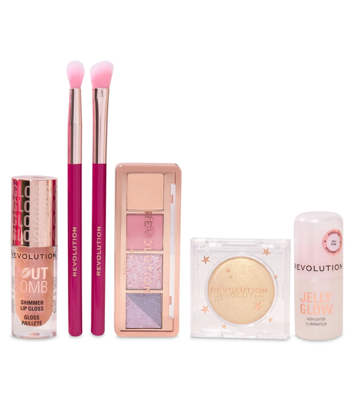 REVOLUTION HIGHLIGHTER STICK JELLY GLOW (INGREDIENTS): AQUA (WATER, EAU), GLYCERIN, SORBITOL, PROPYLENE GLYCOL, CALCIUM ALUMINUM BOROSILICATE, AGAROSE, XANTHAN GUM, PEG-40 HYDROGENATED CASTOR OIL, PHENOXYETHANOL, PARFUM (FRAGRANCE), ETHYLHEXYLGLYCERIN, CAPRYLYL GLYCOL, TIN OXIDE, SYNTHETIC FLUORPHLOGOPITE, VANILLIN, CI 77891 (TITANIUM DIOXIDE), CI 16035 (RED 40 LAKE). REVOLUTION BEAM BRIGHT HIGHLIGHTER GOLDEN GAL (INGREDIENTS): MICA, MAGNESIUM ALUMINUM SILICATE, HYDROGENATED POLYISOBUTENE, BORON NITRIDE, DIMETHICONE, SILICA, PENTAERYTHRITYL TETRAISOSTEARATE, CAPRYLIC/CAPRIC TRIGLYCERIDE, TRIDECYL STEARATE, PHENOXYETHANOL, CETEARETH-20, CAPRYLYL GLYCOL, BIS-DIGLYCERYL POLYACYLADIPATE-2, TRIETHOXYCAPRYLYLSILANE, CI 77891 (TITANIUM DIOXIDE), CI 77491 (IRON OXIDES). REVOLUTION THE MINI ENCHANTED ICON PALETTE (INGREDIENTS): PRESSED PIGMENTS SHADE 2: MICA, SILICA, BORON NITRIDE, DIMETHICONE, HYDROGENATED POLYISOBUTENE, MAGNESIUM STEARATE, POLYETHYLENE, PENTAERYTHRITYL TETRAISOSTEARATE, TRIETHOXYCAPRYLYLSILANE, PHENOXYETHANOL, CAPRYLYL GLYCOL, DIETHYLHEXYL SYRINGYLIDENEMALONATE, CAPRYLIC/CAPRIC TRIGLYCERIDE CI 15850 (RED 7 LAKE), CI 16035 (RED 40 LAKE), CI 77491 (IRON OXIDES), CI 77499 (IRON OXIDES), CI 45410 (RED 28 LAKE), CI 77891 (TITANIUM DIOXIDE). SHADE 3: CALCIUM ALUMINUM BOROSILICATE, DIMETHICONE, HYDROGENATED POLYISOBUTENE, MICA, MAGNESIUM STEARATE, SILICA, POLYETHYLENE, PENTAERYTHRITYL TETRAISOSTEARATE, PHENOXYETHANOL, TIN OXIDE, CAPRYLYL GLYCOL, DIETHYLHEXYL SYRINGYLIDENEMALONATE, CAPRYLIC/CAPRIC TRIGLYCERIDE, CI 77891 (TITANIUM DIOXIDE), CI 16035 (RED 40 LAKE), CI 77499 (IRON OXIDES), CI 15985 (YELLOW 6 LAKE). EYESHADOWS SHADE 1: HYDROGENATED POLYISOBUTENE, CAPRYLIC/CAPRIC TRIGLYCERIDE, ISONONYL ISONONANOATE, CERA MICROCRISTALLINA (MICROCRYSTALLINE WAX, CIRE MICROCRISTALLINE), SILICA, BIS-DIGLYCERYL POLYACYLADIPATE-2, SYNTHETIC WAX (CIRE SYNTHETIQUE), MICA, COPERNICIA CERIFERA WAX (CARNAUBA WAX, CIRE DE CARNAUBA), TRIETHOXYCAPRYLYLSILANE, PHENOXYETHANOL, TOCOPHERYL ACETATE, CAPRYLYL GLYCOL, CI 77491 (IRON OXIDES), CI 77492 (IRON OXIDES), CI 77891 (TITANIUM DIOXIDE). SHADE 4: CALCIUM ALUMINUM BOROSILICATE, MICA, DIMETHICONE, HYDROGENATED POLYISOBUTENE, PENTAERYTHRITYL TETRAISOSTEARATE, SILICA, MAGNESIUM STEARATE, MAGNESIUM MYRISTATE, PHENOXYETHANOL, CAPRYLYL GLYCOL, TIN OXIDE, CI 77499 (IRON OXIDES), CI 77491 (IRON OXIDES), CI 77891 (TITANIUM DIOXIDE). REVOLUTION POUT BOMB SHIMMER LIP GLOSS GLIMMER NUDE (INGREDIENTS): POLYISOBUTENE, ETHYLHEXYL PALMITATE, CERA MICROCRISTALLINA (MICROCRYSTALLINE WAX, CIRE MICROCRYSTALLINE), SILICA DIMETHYL SILYLATE, BUTYROSPERMUM PARKII (SHEA) BUTTER, VP/HEXADECENE COPOLYMER, SYNTHETIC WAX, VP/EICOSENE COPOLYMER, SILICA, GLYCERIN, MICA, POLYSORBATE 20, VANILLIN, PARFUM (FRAGRANCE), RICINUS COMMUNIS (CASTOR) SEED OIL, SODIUM HYALURONATE, TRIBEHENIN, HYDROGENATED CASTOR OIL, SORBETH-30 TETRAISOSTEARATE, TIN OXIDE, PALMITOYL TRIPEPTIDE-1, CI 77891 (TITANIUM DIOXIDE), CI 77491 (IRON OXIDES), CI 16035 (RED 40 LAKE).