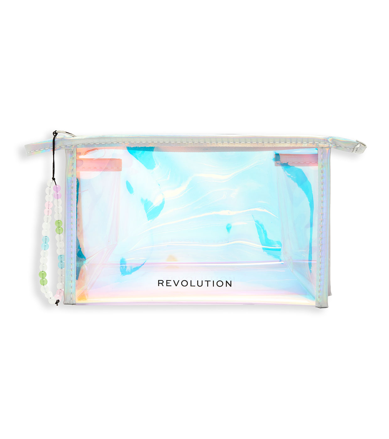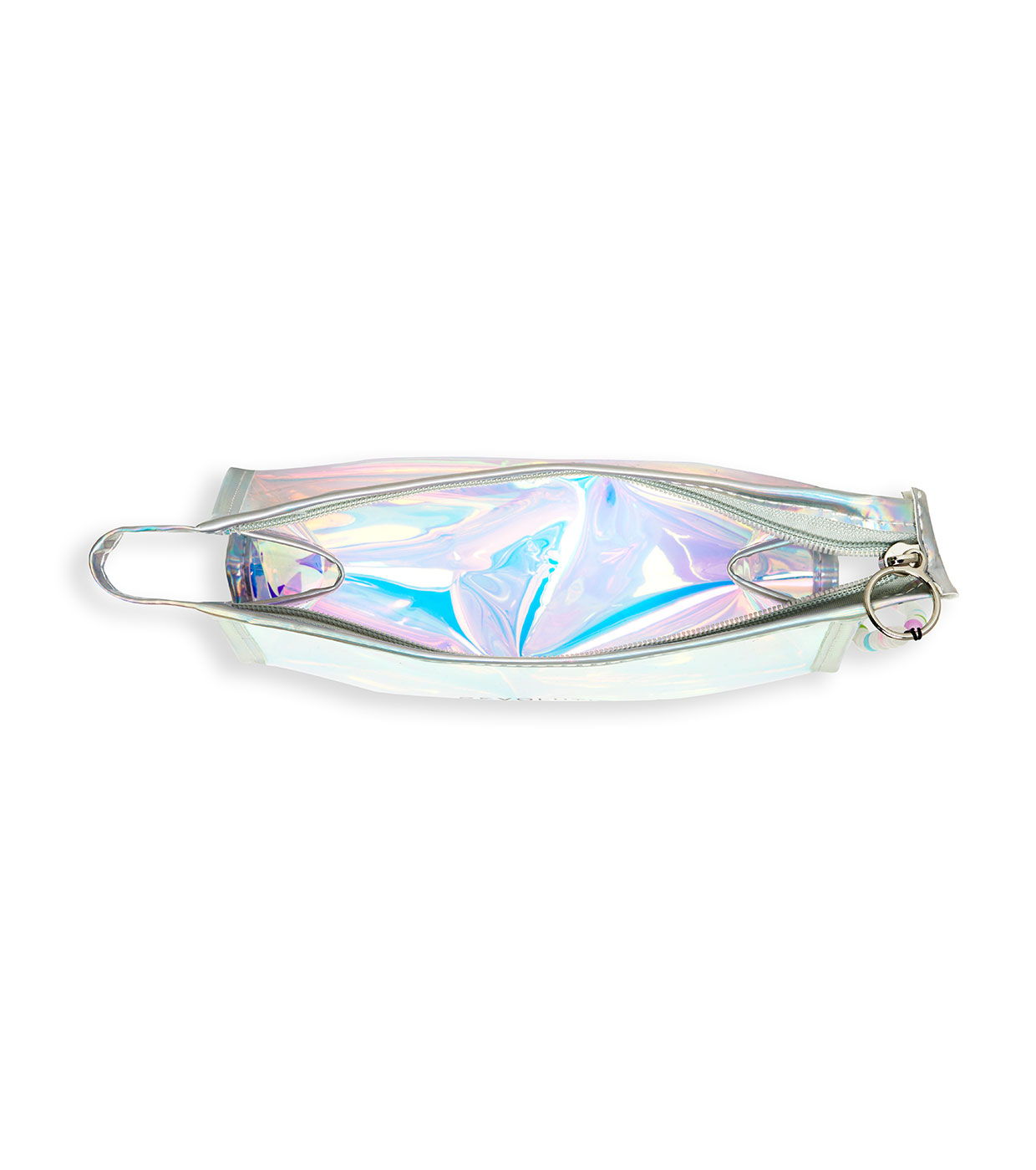 Bewahren Sie Ihre Kosmetikutensilien für die Festivalsaison und darüber hinaus stilvoll in dieser holografischen Kosmetiktasche auf.