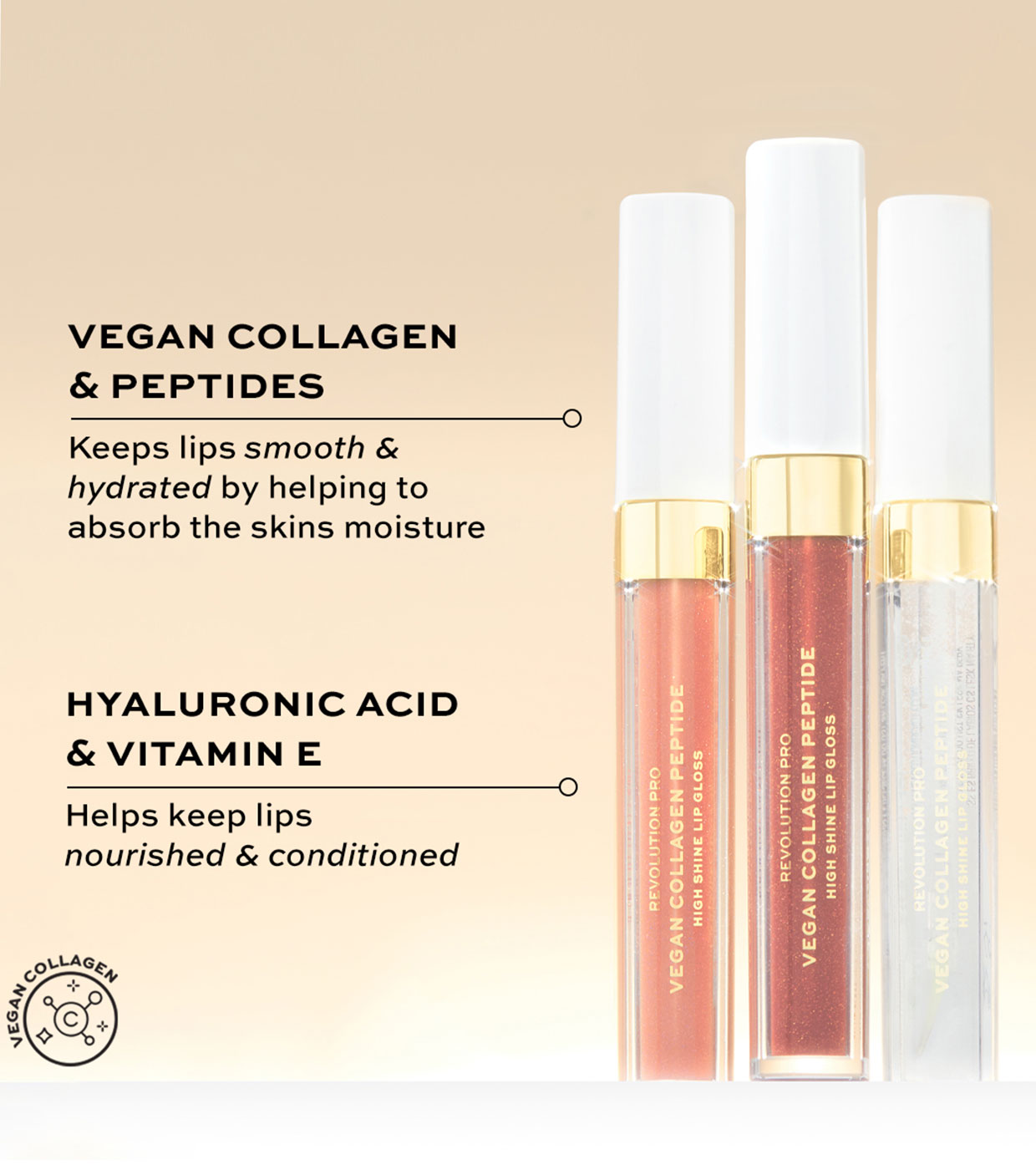Pflegen und befeuchten Sie Ihre Lippen mit Revolution Pro Vegan Collagen Peptide High Shine Lip Gloss.