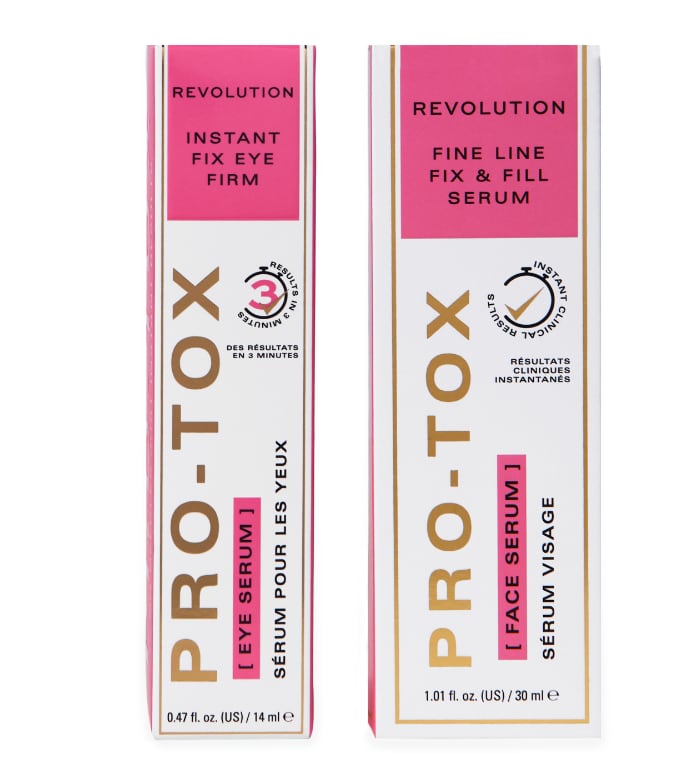 Die Revolution PRO Miracle® Pro-Tox Collection enthält zwei Formeln in Originalgröße, die auf unserem Pro-Tox-Komplex der nächsten Generation basieren und sofortige glättende, straffende und feuchtigkeitsspendende Ergebnisse liefern – ohne Nadeln und ohne Ausfallzeiten.