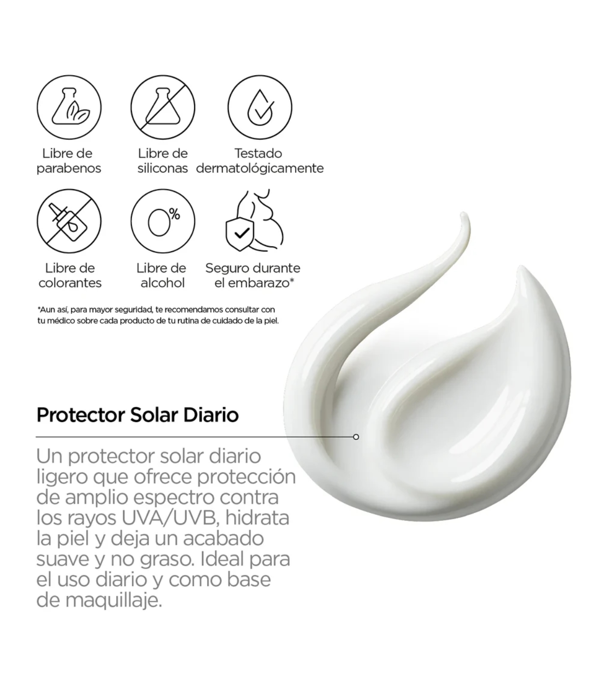 Dieser Sonnenschutz ist perfekt für den täglichen Gebrauch, auch unter Make-up, und für alle Hauttypen geeignet, einschließlich empfindlicher Haut. Seine flüssige Textur verschmilzt perfekt mit der Haut und hinterlässt sie den ganzen Tag lang mit Feuchtigkeit versorgt, weich und geschützt.