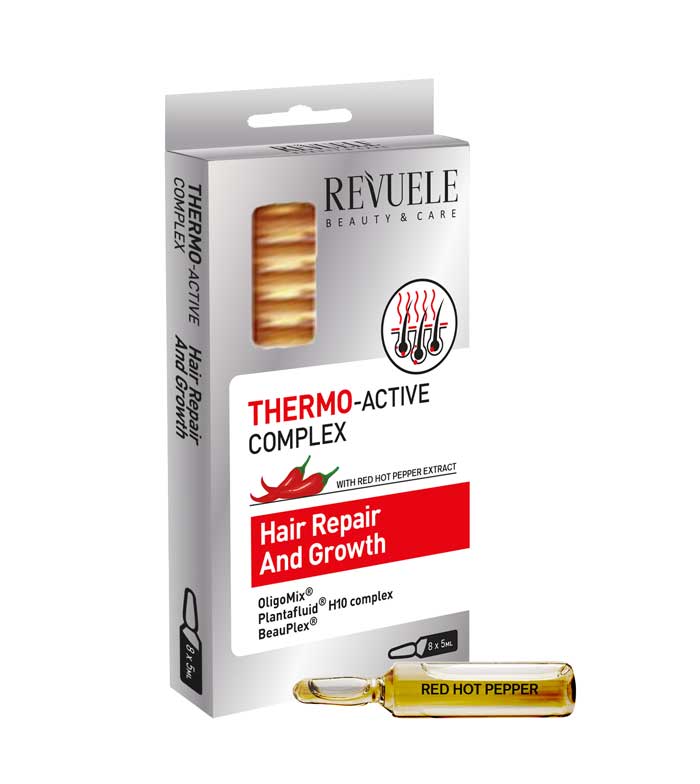 Complejo termo activo que ayuda a reparar el cabello dañado y ayuda a su crecimiento de Revuele.