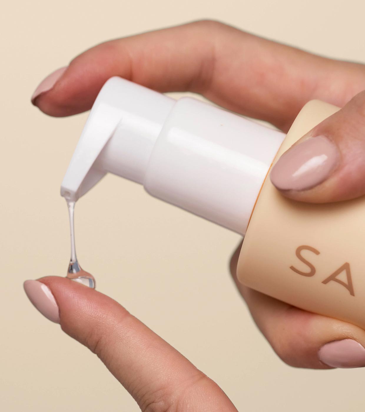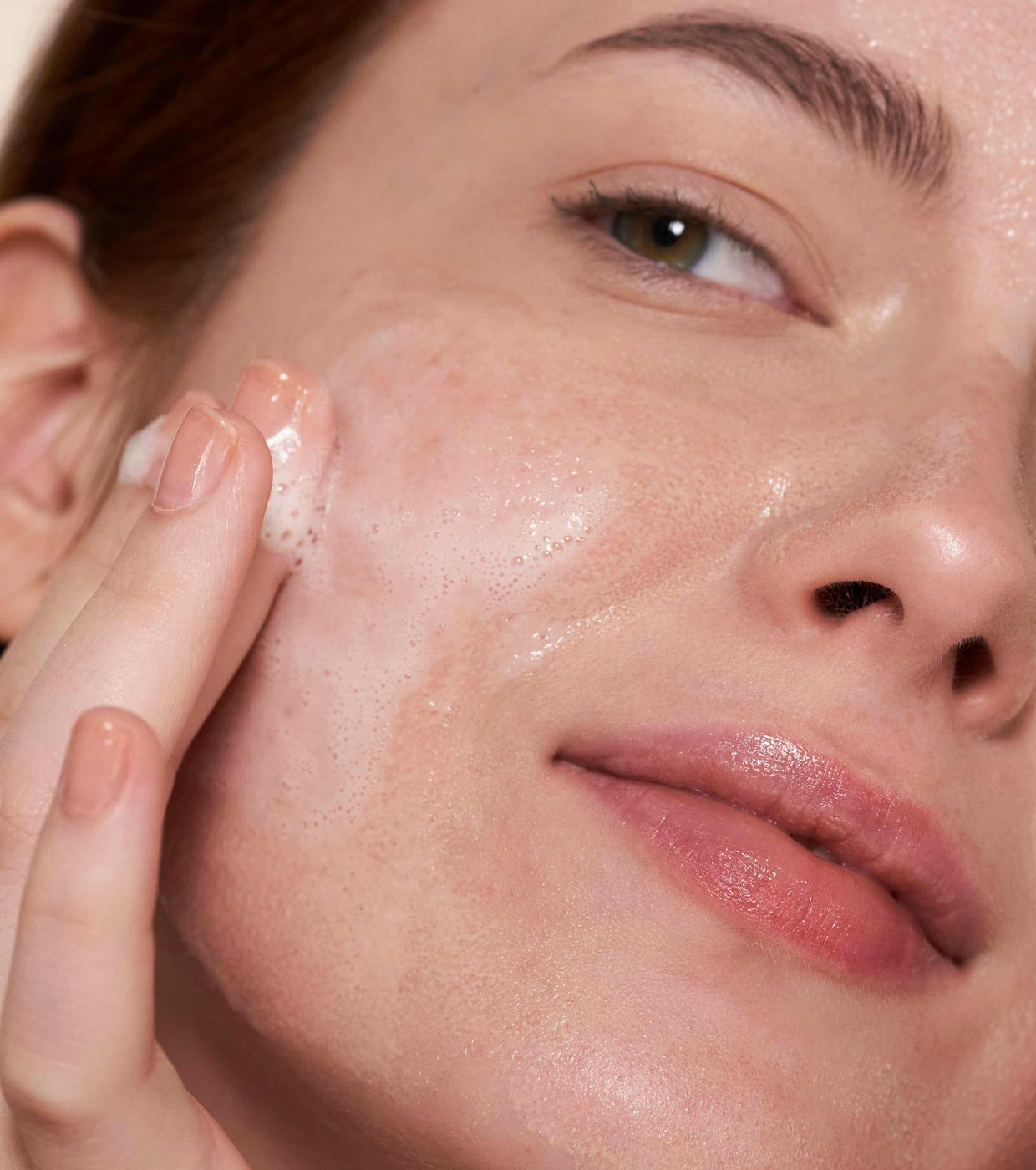 Gießen Sie einen Pumpstoß Brisa in Ihre nassen Hände und massieren Sie ihn sanft in die bereits feuchte Haut ein, bis ein leichter Schaum entsteht.